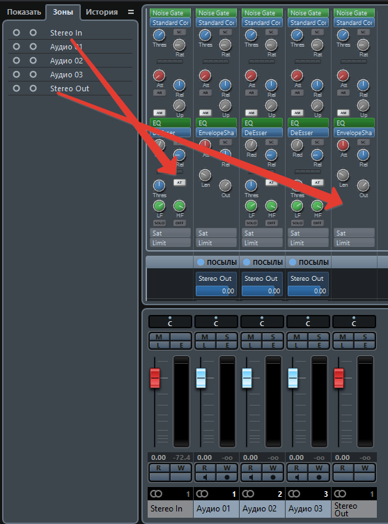 в изменение масштаба. Сначала я улыбнулся, но когда за правую часть консоли пришлось то же вцепиться мышкой и начинать ее то вправо, то влево и многократноот одного края, до другого, я не понял, это или смеяться надо, или ржать. Мельнула мысль, назначить масштабирование треков на горячие клавиши, но не успел попробовать, потому как все не мог разобраться с экспортом эффектов с шины FX Bus. Кстати, горячие клавиши, выход был ы идеальным!