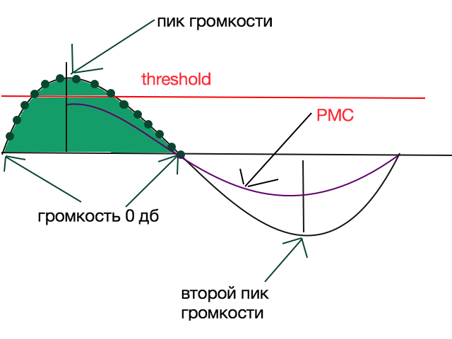 РМС это среднеквадратичная громкость между как минимум двумя наивысшими точками амплитуды.