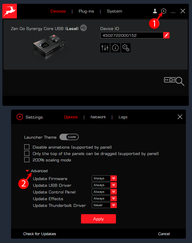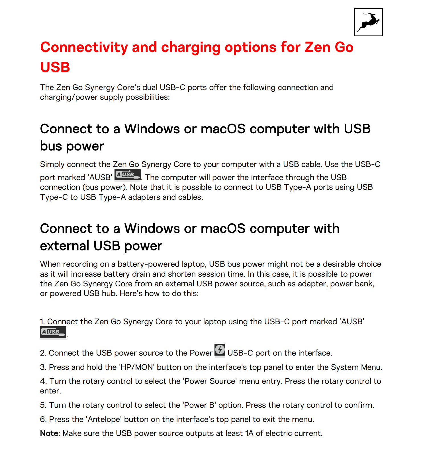● Power the Zen Tour Synergy Core from an external USB power source, such as adapter, powered USB hub, or power bank (a minimum of 1A electric current is required). This way, the interface won't drain battery power from your laptop or mobile device, allowing for longer recording sessions.