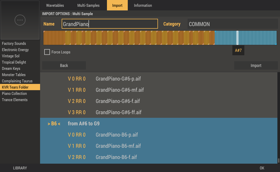 Convert and load single- or multi-samples with different velocities and round robin. An automatic note detection recognizes the embedded MIDI unity note information, or identifies a note token within the filename and assigns the samples to the key map. The content is compressed and optimized for load times. For example, an uncompressed piano multi-sample with a filesize of 197MB only uses ~50MB after import.
