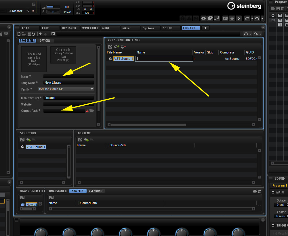Вообщем сделал undock страницы library creator и затащил с медиабея Халиона , иначе ну никак , но семплы типа отдельно добавлять ! Хорошо добавил , но ругается красненький треугольник на самом пресете на Sourcepath ... Ну ладно , попробовал сохранить , сохраняет в разширении library с надпсью invalid , где vstsound в упор не вижу ! Короче вынос мозга пока ...
