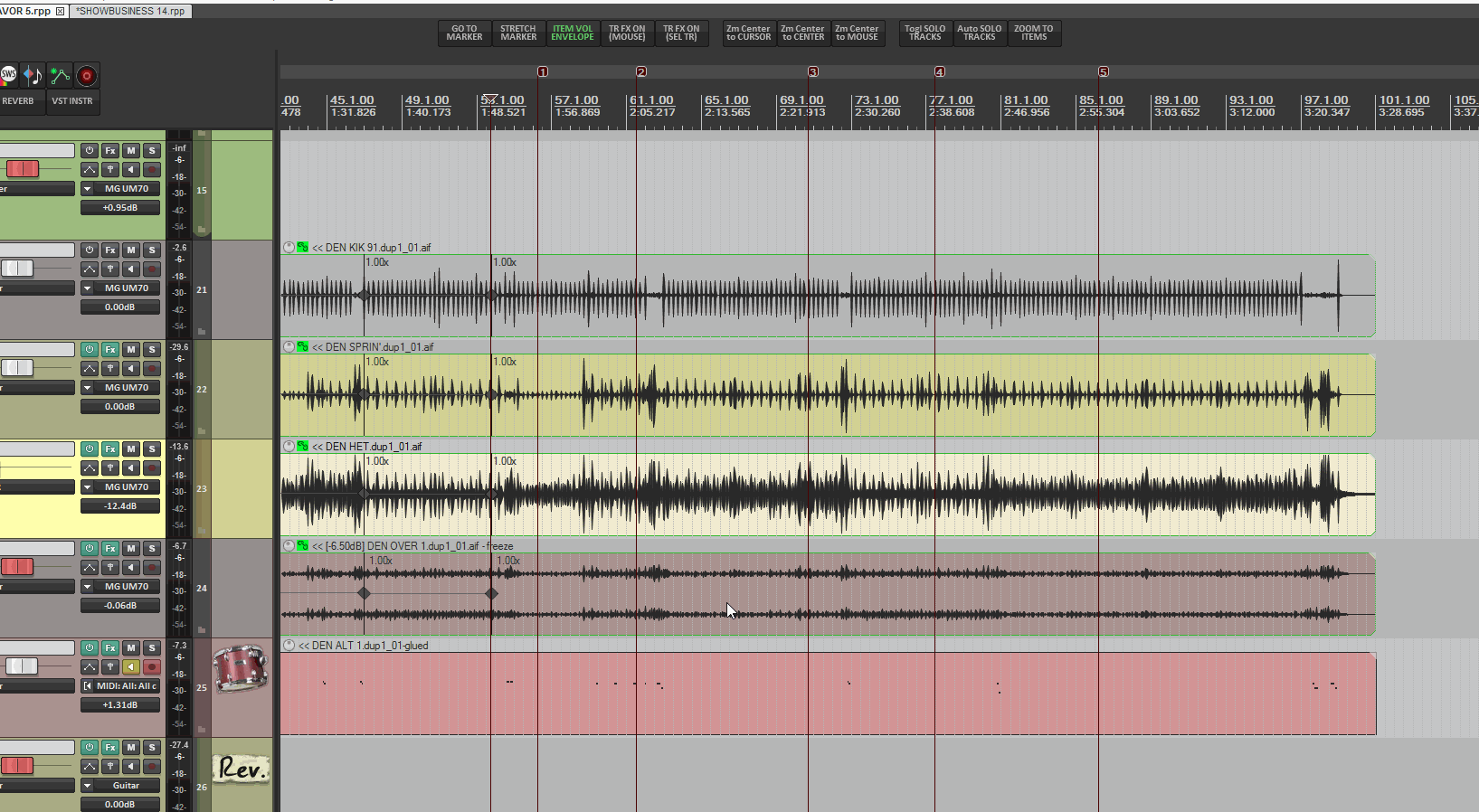 По памяти ... я там монтажил вокальный трек с драм лупом, просто быстро перескакивая с трека на трек и клипа на клип, с огибающей уровня и все было мгновенно. Мышой изредка что-то как то там...