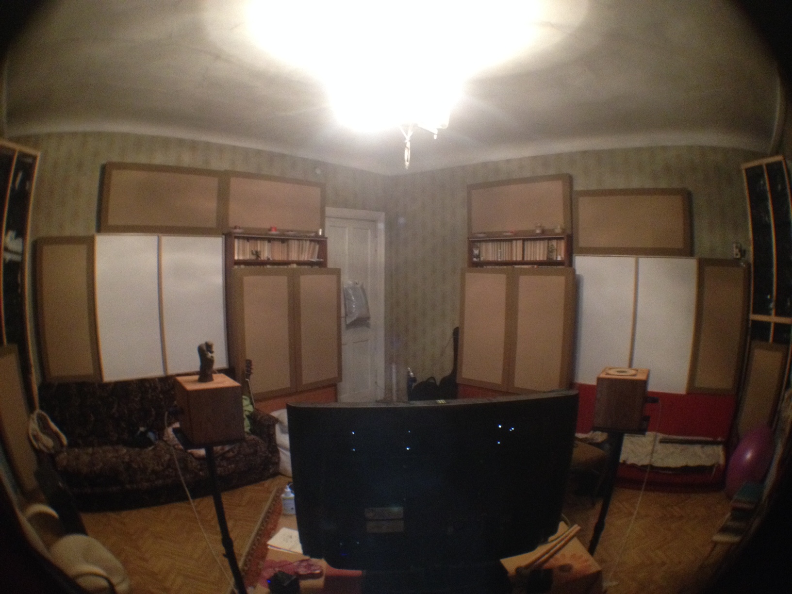 Имеется 12 панелей ЭХОКОР по 10 см. 2 суперчанка (ребра по 60 см) ПОЧТИ до потолка. 4 панели НЧКП UW Acoustics.