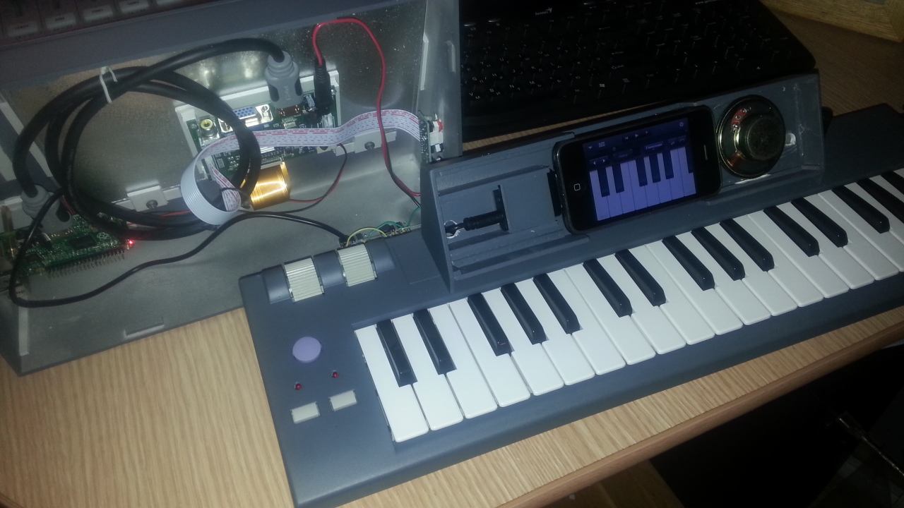 К клавиатуре «пристегивается» модуль из 10 дюймого дисплея, Raspberry PI, видеокамеры, на кронштейне, направленной сверху на клавиши. В корпусе модуля размещается пульт управления роликами и\или нотным секвенсером, аудио усилитель, небольшой динамик и аккумуляторы. Имеются разъемы для педалей. Управление софтом идет через GPIO, т.е. пиновый интерфейс. Пишутся специализированные программы. Мышка и клавиатура не применяется. Управление роликами, видеокамерой через энкодеры, кнопками, джостиком, через тачскрин дисплея. Также выбираются и видеофайлы с SD карты \ из библиотеки.