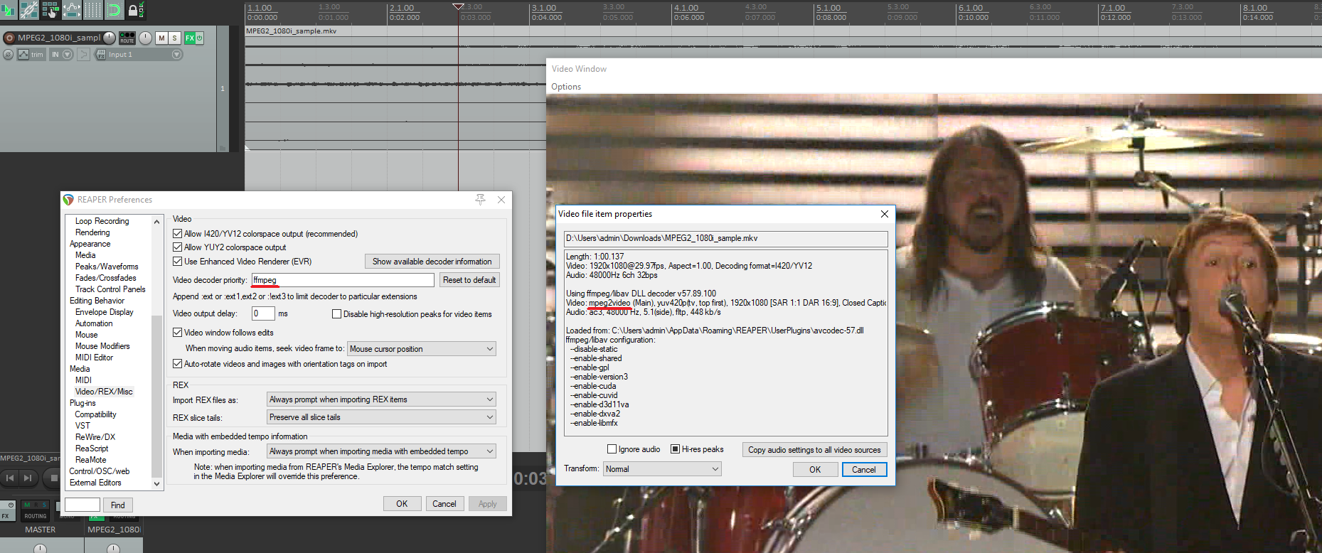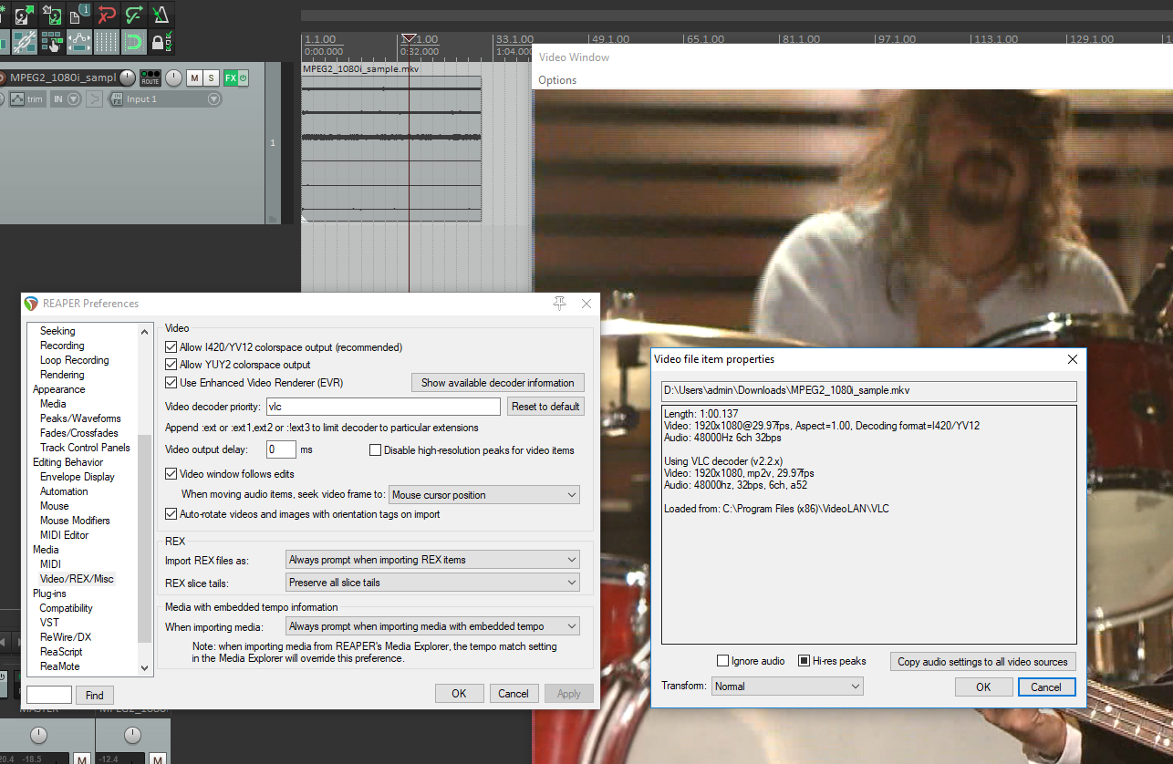 Reaper 5 упорно открывает mpeg 2 через directshow , в результате зеленый экран без видео
