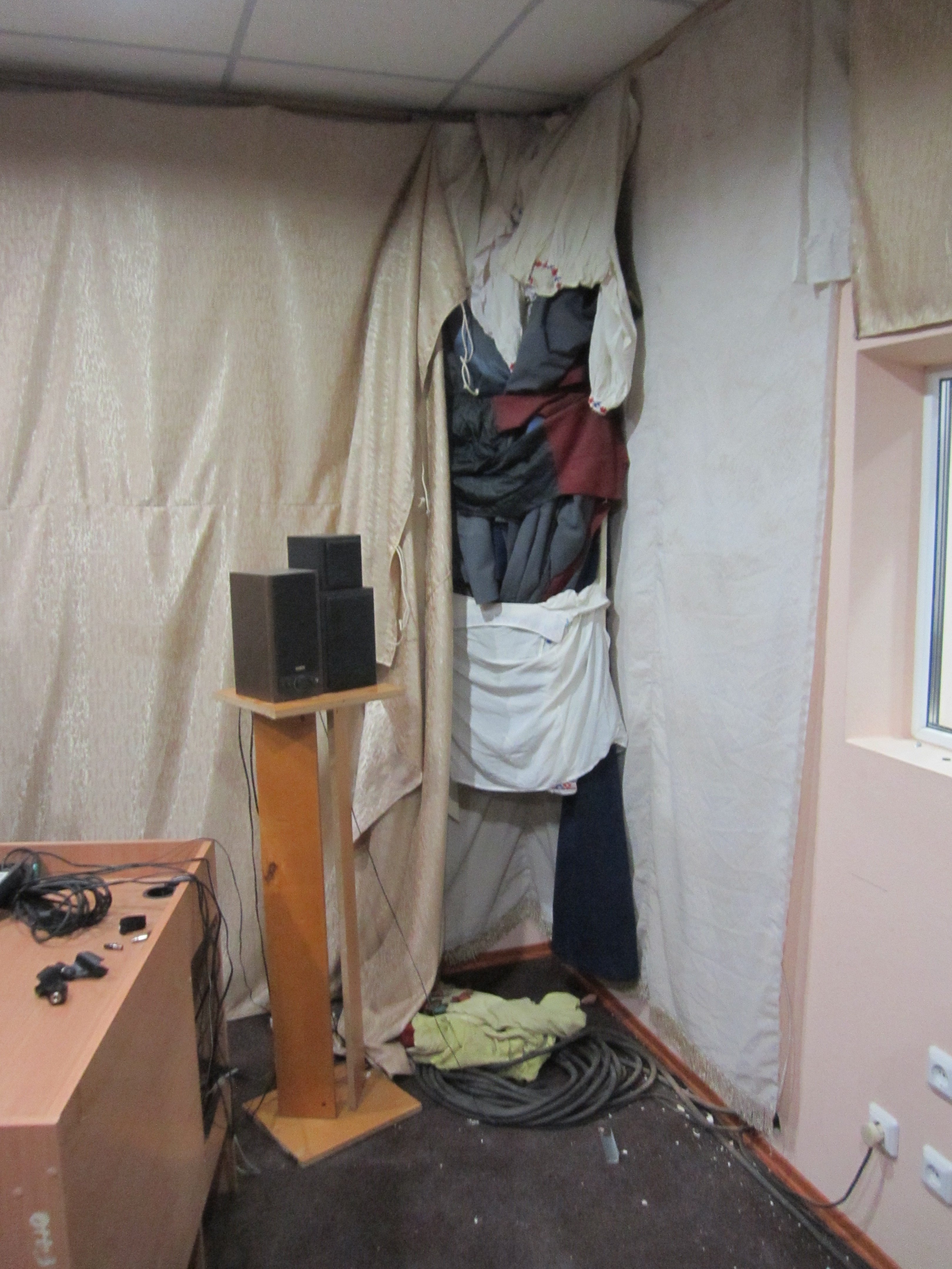 Это так, просто проба и пристрелка. Планирую сделать замеры поближе к стене, потом у окна попробовать в разных позициях, по золотому сечению еще... Но сталкнулся с одной проблемой, стоики под мониторы оказались, мягко говоря не того калибра что акустика. Придется сделать что то типа подставки под мониторы, крайне массивные (планирую песком заполнить их полую конструкцию) и уже с заданным значением 120 см между колонками + хочу сразу задать угло правильный, а то мудиться с транспортиром, длинными палками и лазерной указкой - надоело. + все равно есть какой то перекос по вертикали так как стойки слабоваты. Да и кот у меня гончий, боюсь что собьет ненароком.