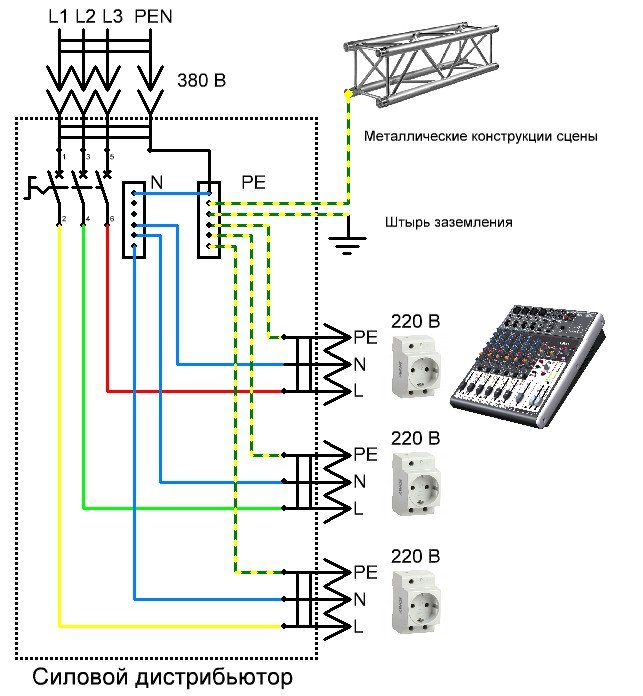 Не надо ничего колхозить. Питание всех современных однофазных приборов - трехпроводное (фаза/L, ноль/N, земля/PE). Корпус пульта через вилку питания гальванически соединен с проводом PE, который в свою очередь в силовом сетевом дистрибьюторе должен быть высажен на заземляющую шину, а заземляющая шина медным проводом не менее 10мм2 соединена с штыревым заземлителем.@Methafuzz, а если например от микщерного пульта этот провод тянуть к штырю, куда именно он подключается, ведь на микшере нет специального разьема ждя таких дел, раскручивать пульт и туда колхозить к блоку питания? что-то нге догоняю я(