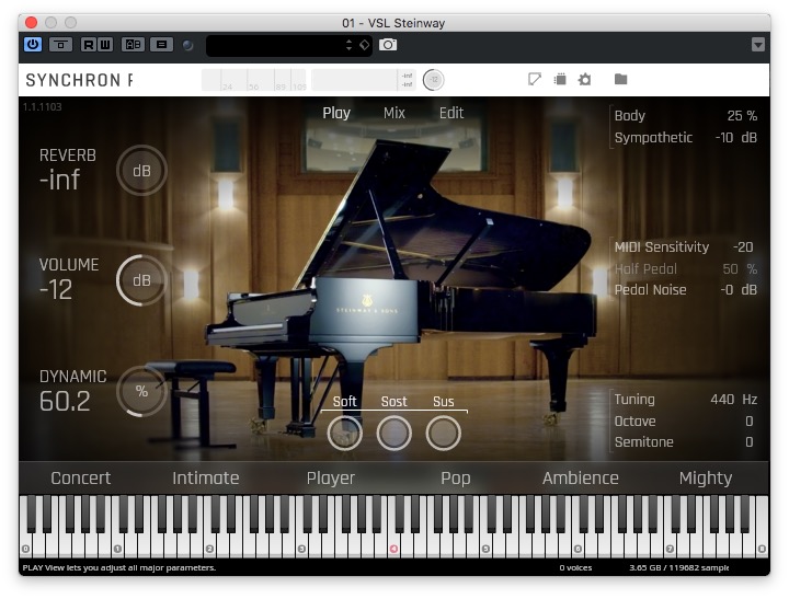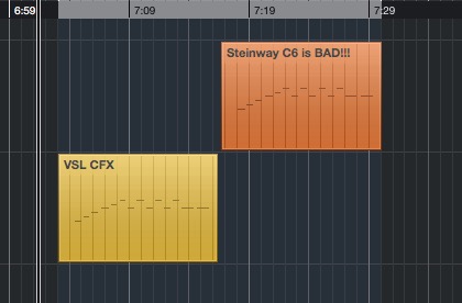 при одинаковых установках один и тот же миди-фрагмент по-разному играются на венских стенвее и CFX. чтобы их как-то уравнять, стенвею приходится ужимать велосити к низу (на картинке - с надписью lower velocity), иначе кричит и грубит. И нота до второй октавы какая-то разбитая, мож поправят. С педалью всё норм у него.