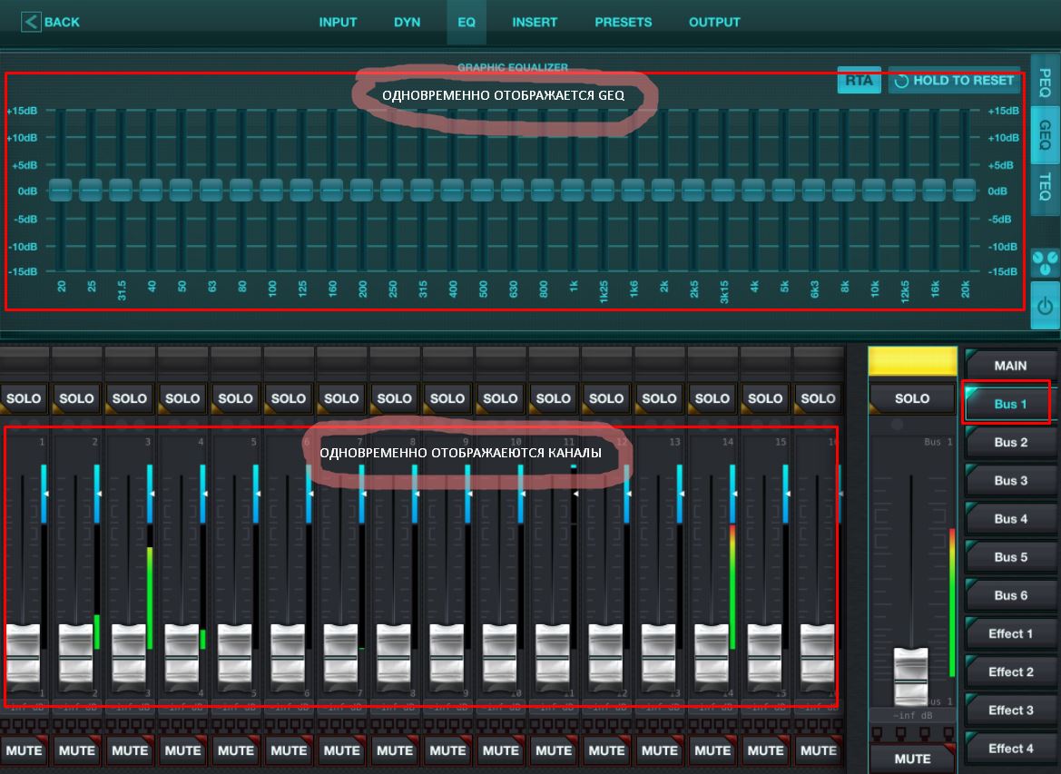 - GEQ для 10 AUX + GEQ для MAIN;