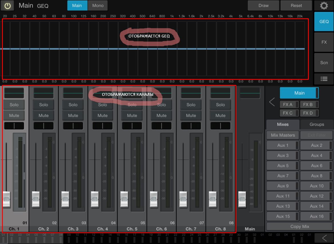 - Удобное управление с iPad, для отстройки мониторов (проствистывание). А именно, что бы в приложении отображались одновременно GEQ и каналы (принцип такой: поднял громкость микрофона в мониторе, засвистело, прибрал громкость, вырезал частоту). Типа как на xr18 (скрин)