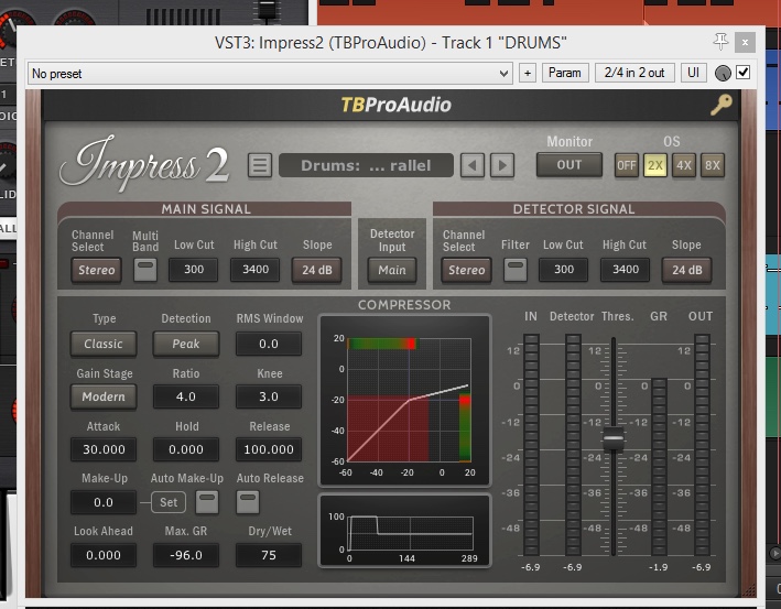 Ни разу за всю практику он мне не пропустил ничего, хотя я зачастую "даю в него" много лимитера и много компрессии. Чтоб получить от него классический трешхолд, нужно убавить гейн ровно на то положение на сколько стоит трешхолд, получится чистый даунуард компрессор. Но я такой стиль компрессии не люблю, мне больше нравится как там изначально устроено всё, т.е. ручка трешхолда автоматизирована сразу на 2 параметра, на трешхолд и на мэйкап. Соответственно сразу автоматизируется и работа компрессора и последующая обработка под лимитр. Удобно, 1ручка всего! Нужно больше компрессии и меньше лимитра, опускаю немного гейн, хочется больше лимитра меньше компрессии: гейн выше. У меня гейн обычно либо в 0 стоит, либо в -3 (если хочется немного динамики). Это всё подробно в мануале описано кстати.