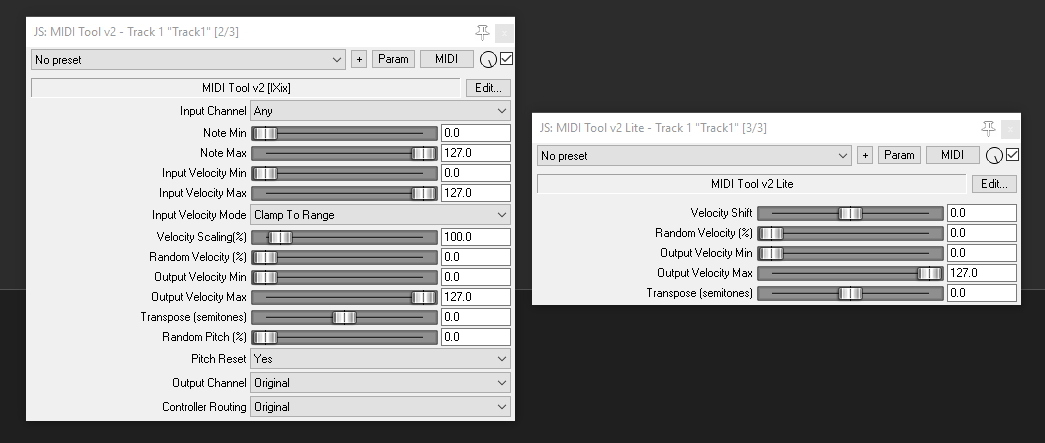 Ещё одна маленькая функциональная штуковина, которой не хватало после Сонара - простой миди плагин, поднимающий/опускающий велосити, тон, лимитирующий велосити сверху и снизу, ну и рандомайзер велосити. Отчасти аналог Сонаровского миди плагина "Velocity", ну и копирующий некоторые функции с миди трека. Поскольку сразу нужного плагина не было, я взял ближайший аналог MIDI Tool v2 и допилил до нужной кондиции, выбросив лишние ручки и менюшки. Для сравнения на скриншоте оригинальный плагин слева, допиленный - справа: