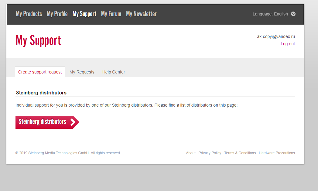 @felix dounaev, )))))))) Эта кнопка (Request support) есть и у меня в кабинете. Да только она ведет на страницу My Support, где просто предлагают дистрибьютеров в твоей стране (у нас Yamaha) а также путешествие по другим страницам поддержки: FAQ и еще пустую страницу "my request" которая вообще не понятно зачем. Страница с российским дистрибьютером (Yamaha) ведет на ямаховскую страницу, где предлагается выбрать интересующий тебя продукт - и раскрывающемся в списке нет софта steinberg))) А Вы куда по этой кнопке попадали?