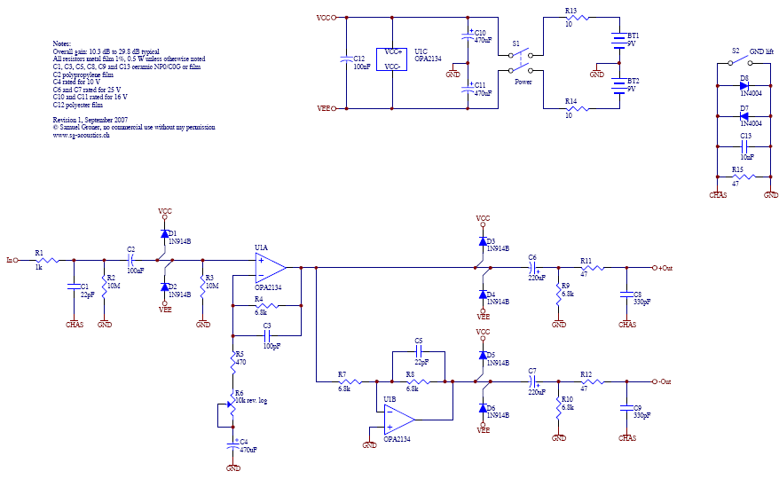 Помимо этого перед этой схемой в том же стальном корпусе от Дигилаба стоит отключаемый типа Tube Screamer с опшией НЧ регулировки и режимом овердрайв/дистошн. Так же с двушным питанием. Из за этого все оригинальные моденные скримеры на батарейке сильно отстали. Но если топику нужна батарейка пусть смакетирует схему с сайта Лонга.