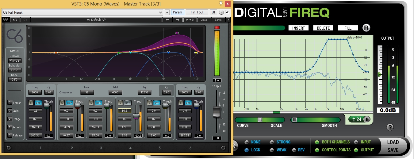 Внимание!!! Тестируем исключительно на слух, "вычитание" здесь по ряду причин не сработает, сигналы хоть и записаны с одного "прогона", но в них задействованы разные приборы (тот же ART ZDirect), а также сигнал поступал на разные каналы пульта, каждый цифровался отдельно... В общем cигналы не вычитаются, но на мой слух они не отличимы, даже используя на мастере экстремальные настройки EQ и компрессоров лично я не слышу разницы. В картинке пример настроек, где я создаю "увеличительное стекло" на частотах, на которых обычно считал что "палится" импульс.
