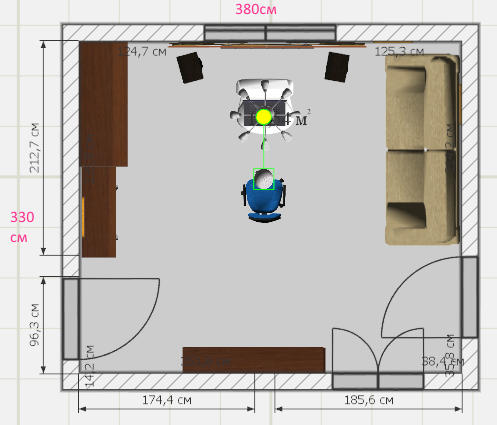 Вроде пробовал нечто подобное. Там же я в центре буду находится, а значит, баса не будет вообще. Поэтому перебрался дальше от фронтальной стены назад, чтобы бас появился. Грубо говоря, мониторы сейчас на 38% от фронт-стены, а я на 38% от задней. Ну ещё попробую.
