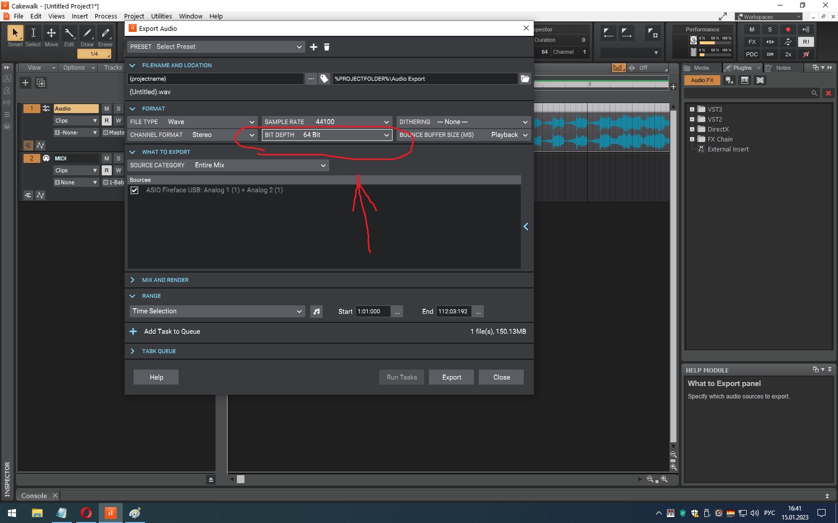 Столкнулся с такой фигнёй. Законченный трек перевожу в wav, выставляю 64 вит. Виндосовский плейер и jetAudio отказываются его воспроизводить ( но видят ). Делаю тоже самое с 32 бит. обработкой - всё нормально воспроизводится.