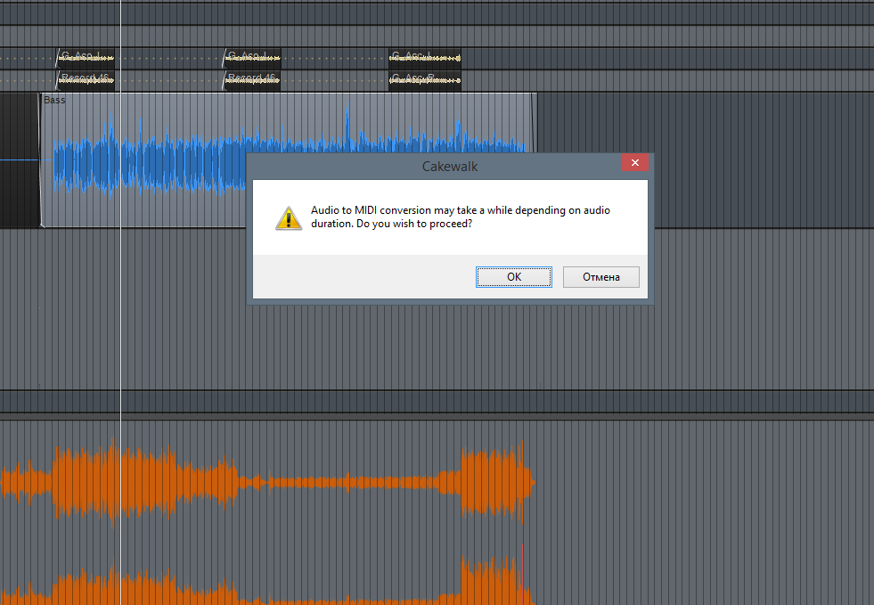 Зачем? Всё должно работать без всякой подготовки. Просто тащим на МИДИ трек аудиоклип. Появляется сообщение, (на картинке) - нажимаем ОК и всё прекрасно конвертируется.