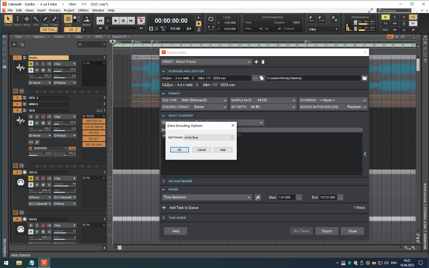 Это окно выскакивает если выбрать для экспорта формат WAV(Microsoft) и 64 бита (непонятно только зачем?) . При выборе стандартного WAV никакой проблемы экспортировать в 44 килогерца и 64!!!! БИТА (опять вопрос - ЗАЧЕМ???) Cakewalk вообще так удобно устроен, что использовать какие-то сторонние программы для мастеринга (и соответственно экспортировать в повышенной битности) выглядит как изощрённый мазохизм))) Если только не отправлять на железный мастеринг в какую-то крутую студию. Но там требуют, как правило 44.100 и 24 бита (делал когда-то мастеринг альбома у Субботина).