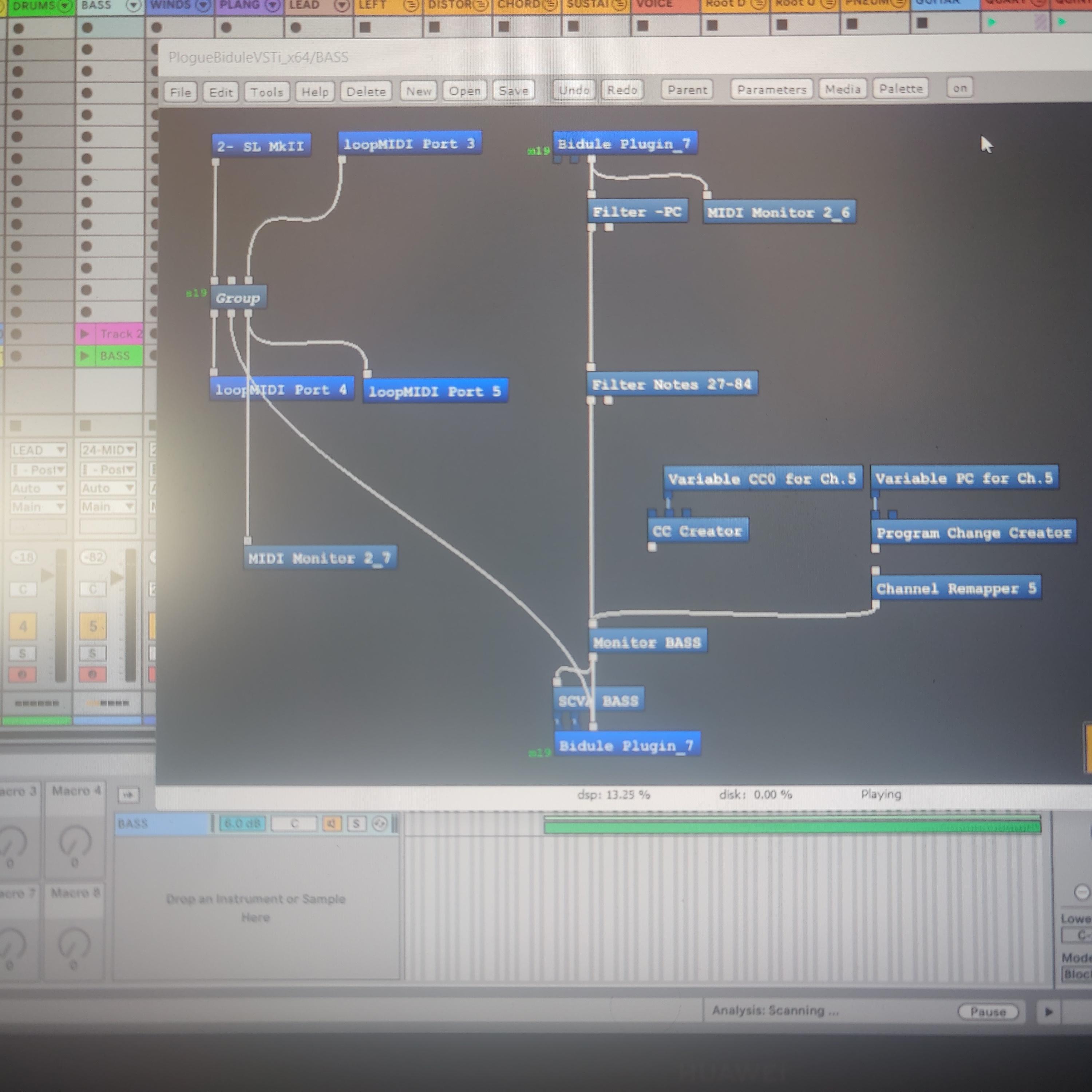 Тогда, попробовал компромиссное решение: я в Ableton заменил вход Port 3 "In" контроллера на LoopMIDI (a Port 3 завёл в Bidule и подал сигналы с него одновременно в блок переназначения и в LoopMIDI, направленный в Ableton)...