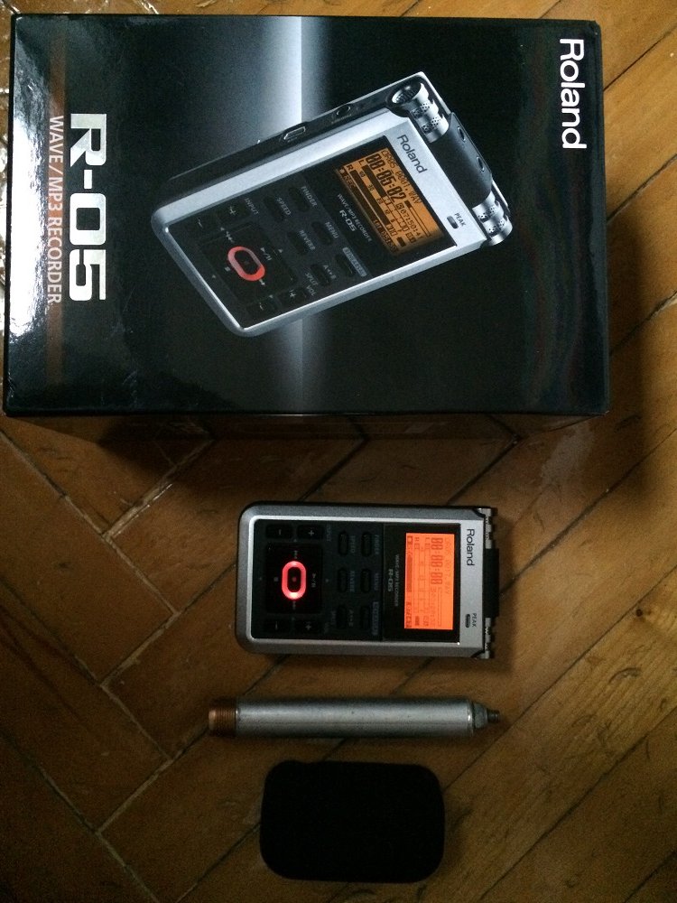 1) Рекордер Roland R-05. Состояние отличное. В подарок - самодельная ручка - универсал, на которую снизу можно закрепить внешний микрофон или вкрутить на микрофонную стойку. Цена 7 т. рублей.