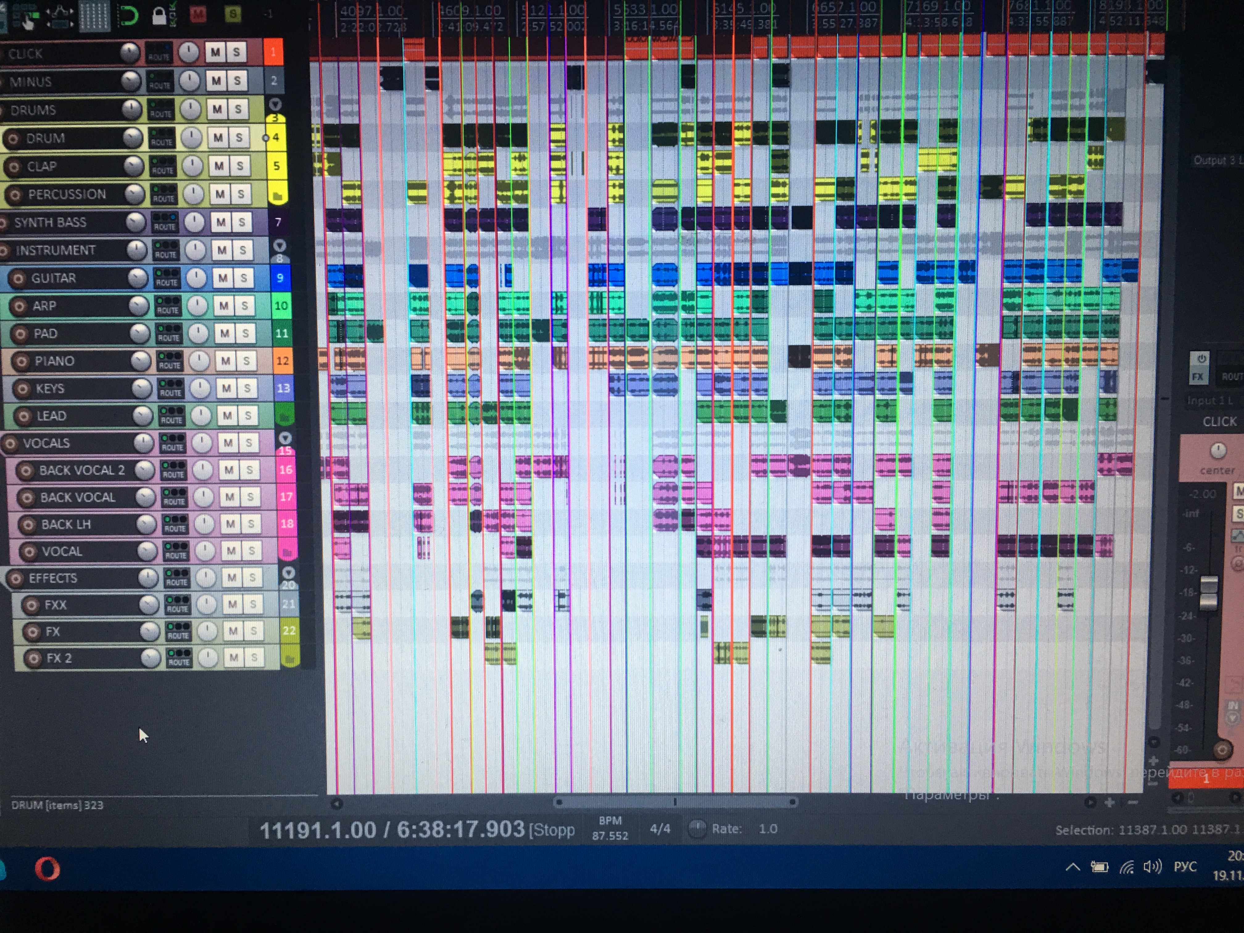 Имеется проэкт с плейбеками, 19 дорожек (percussions, claps, bass, piano, synth, fx, back vocal и т.д..), организован по принципу region playlist, всего в одном проэкте на данный момент около 100 регионов (композиций).