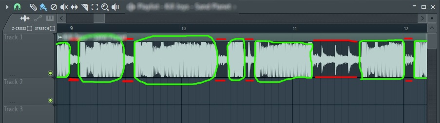 У нас есть бит с четким разграничением баса и инструментала.Тоесть проще говоря басс играет какое то время, резко прекращается, играет - прекращается и так далее, на картинке видно, зеленым показан бас, а красным подчеркнуты места, без баса.Суть в том что когда он прекращается голос как бы "выпирает" и становится очень громким в этих местах подчеркнутых красным цветом.Как это исправить? Неужели вручную делать автоматизацию на уменьшение громкости голоса в этих местах, или как это сделать автоматически? Это вроде не обычный сайдчейн, потому что сайдчейн наоборот делает тише в определенный момент.