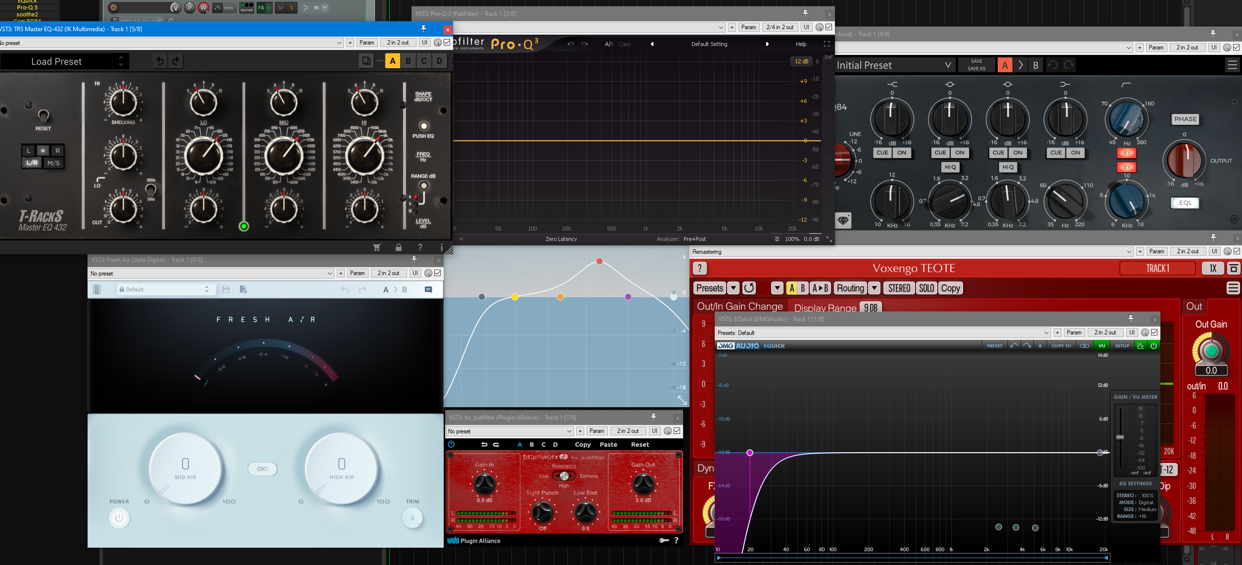 Но чаще всего из эквов на треках Пенсадовский экв. На мастер не вешаю, потому что там специфичная низкая полоса, но можно было бы и там... Мастеринговые эквы у меня - Маджента, Грин, Эрин, Айвори, Скарлетт... выбираю по ощущениям, но чаще всего, кстати Кофе, просто потому, что он в последнем темплейте прописался, так часто и остаётся)). А если музон с жесткой плотной ритм-секцией, то на мастер - однозначно Даймонд Колор экв - это мастхевище. При всёй простоте он не прост. Там, правда, преамп для меня ядрёный - задирает верх больше, чем хотелось бы, но иногда можно включить, и высокую полосу уже не трогать). Если ставлю на мастер Даймонд, то к нему комплект - Лифт. У меня есть достойные небуловские эквалайзеры, но просто ленюсь их перебирать. Из небульных использую почти всю динамику Петерика, из любимчиков - Sum100 и RA6 (особенно сейчас с обновленным скином Макса). Из небуловских эквов любимейший - Verona от Лондон Акустикс, тех что сделали TAIPEI. Пленка эта наверняка пропишется (до нее использовал петериковский studer). Если с пониманием, то taipei можно чуть ли не вслепую применять деструктивно к трекам сессии с разной степенью сатурации в зависимости от материала (и без перегруза конечно), чтобы потом не грузить процессор. Я уже пробовал - реально нравится. От тех же Лондон Акустикс частенько использую энхансер (типа Виталайзера) Энна - только услышал тоже сразу же купил (для барабанов и вокала). Как им так удаётся?) Так же есть их классный компрессор Брайтон, но почему-то не так часто применяю, как петериковские компы. Алгоритмические компы (softube, mcdsp, ik mult, ssl, PA) так же часто заходят. Преампы разные перебираю, но привык к небульному стоковому портико миксбас и вероновские. Для треков еще использую Кэмел, Голд, Лайм. Ну, т.е. я на вектора подсел)). Особенно, если не конвейерная работа, когда надо спешить. При конвейере почти все, кроме мастер эква, на алгоритмиках. Но это больше касается не музыки, а телепередач, док фильмов и пр. Там почти нет смысла использовать АА, строгие темплейты, хотя голос диктора можно жирно обработать, но и тем же миксбоксом от ик мультимедии норм выходит (так что я не совсем АА-сектант)).