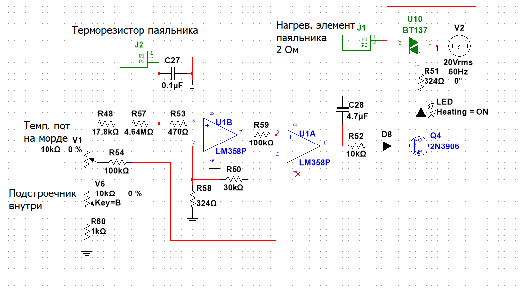 Когда всё адекватно заработает (т.к. нужно будет ещё же и откалибровать температуру заново), то оч советую прикрутить к схеме нормальное стабилизированное питание (в идеале прецизионным стабом), ибо сейчас по схеме стоит примитивный параметрический на одном стабилитроне, и уставка температуры будет несколько плавать в зависимости от дрейфа напряжения питания и нагрева стабилитрона.