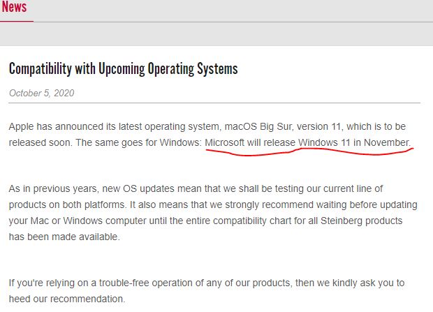 Странное объявление на сайте Steinberg - в его тексте с рекомендацией не торопиться с переходом на новые версии операционных систем, упоминается выход Windows 11 в ноябре - ошибка или нет? Вроде, как официально тестируются очередные беты 10-ки.