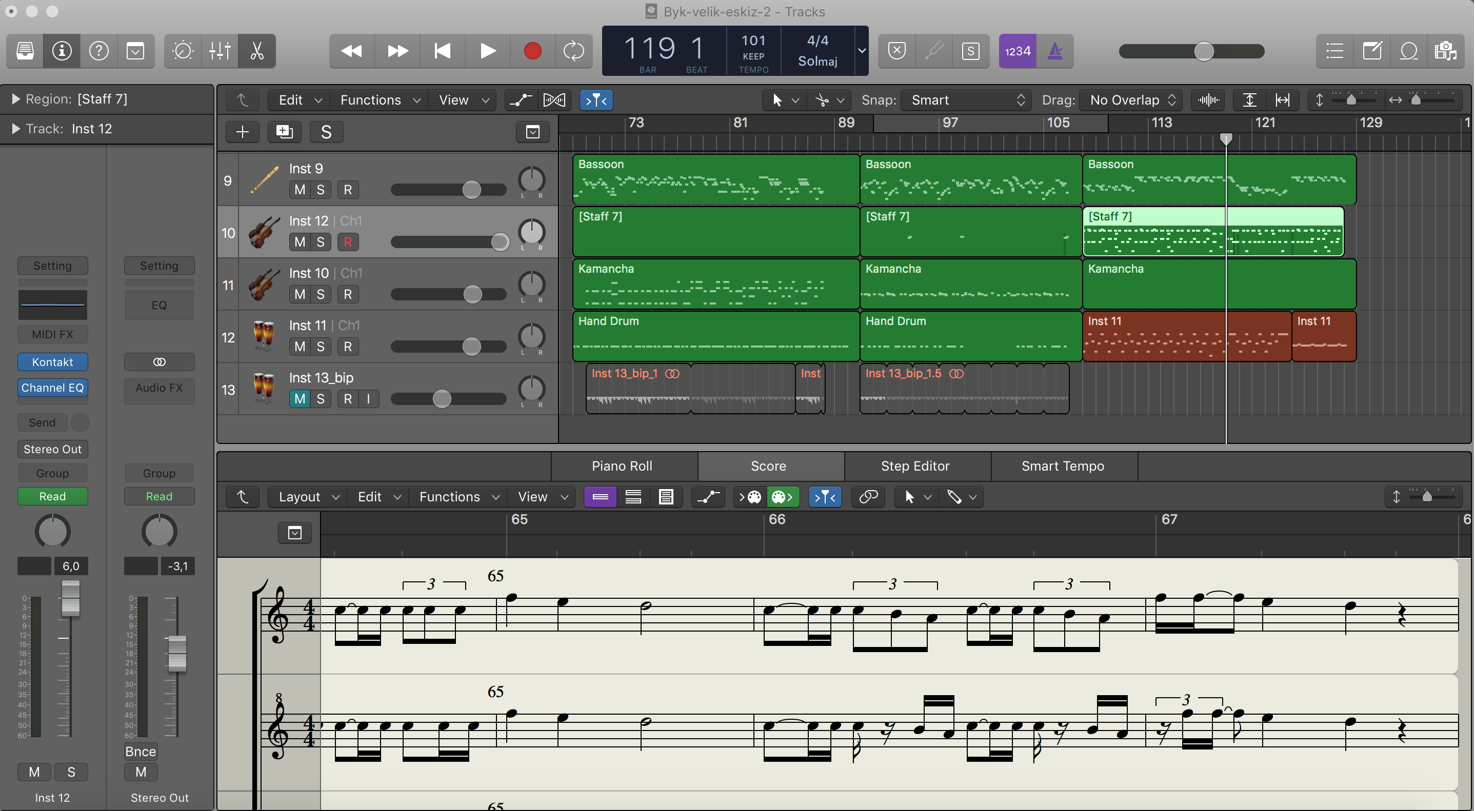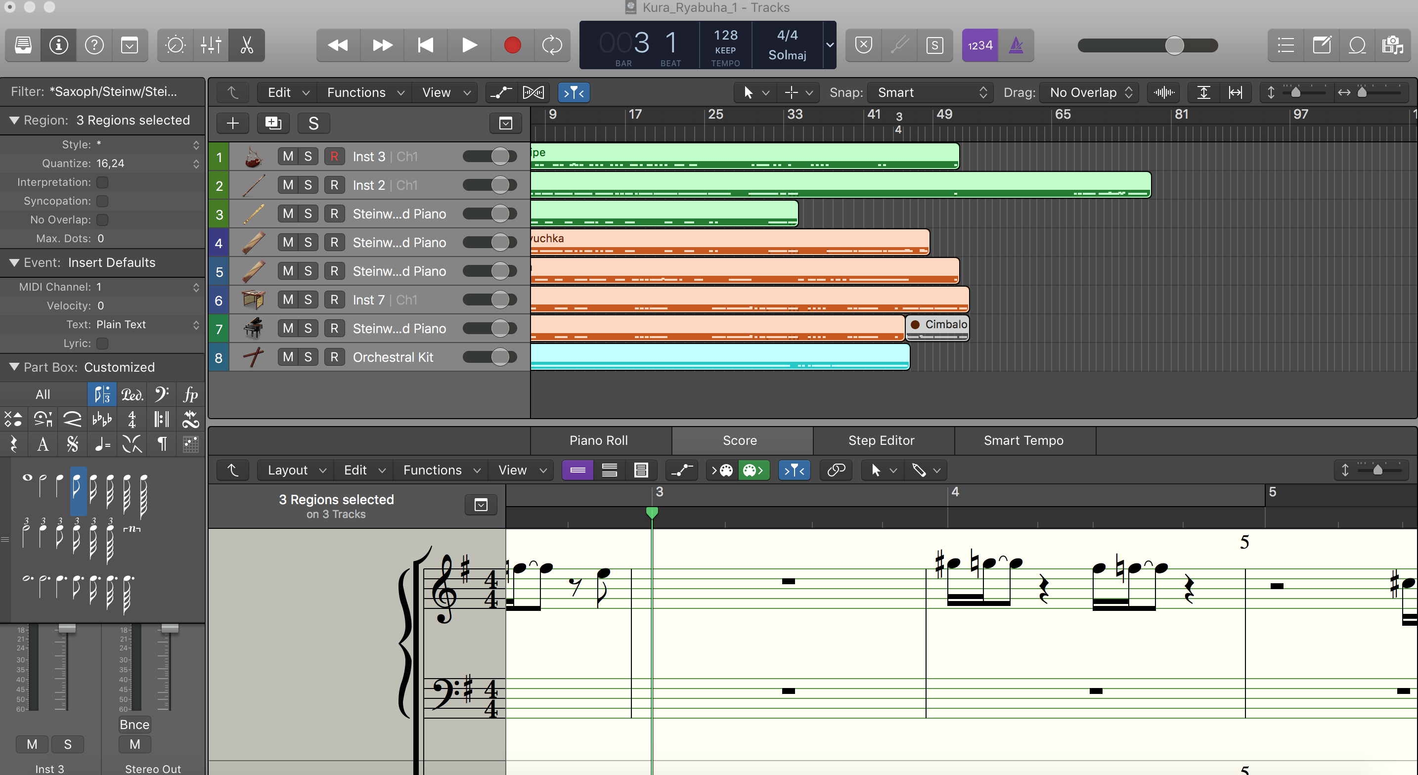 @nanad, галочка стоит напротив нужного вам инструмента. Если на треке все порезано на части, ноты будет показывать только открытой части. Чтобы посмотреть все такты на треке нужно выделить нарезанные части и потом "склеить" их инструментом отмеченным галочкой на картинке. Также нужно "склеивать" отдельные нарезанные части на треке перед экспортом в другие редакторы нот. Иначе раскинет все на отдельные нотоносцы как отдельные партии. Кажется это все.