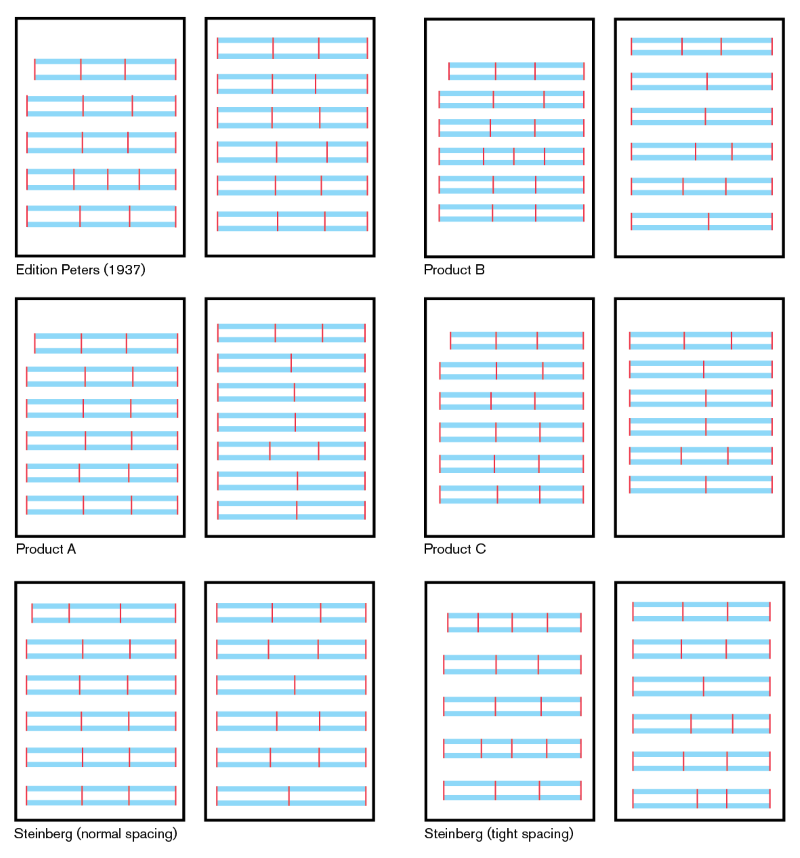 Как всю фугу расположили на двух страницах разные редакторы (только схема). Product A = Sibelius, B = Finale, С = Lilypond. У Дорико два варианта – с нормальным и тесным режимами юстировки.