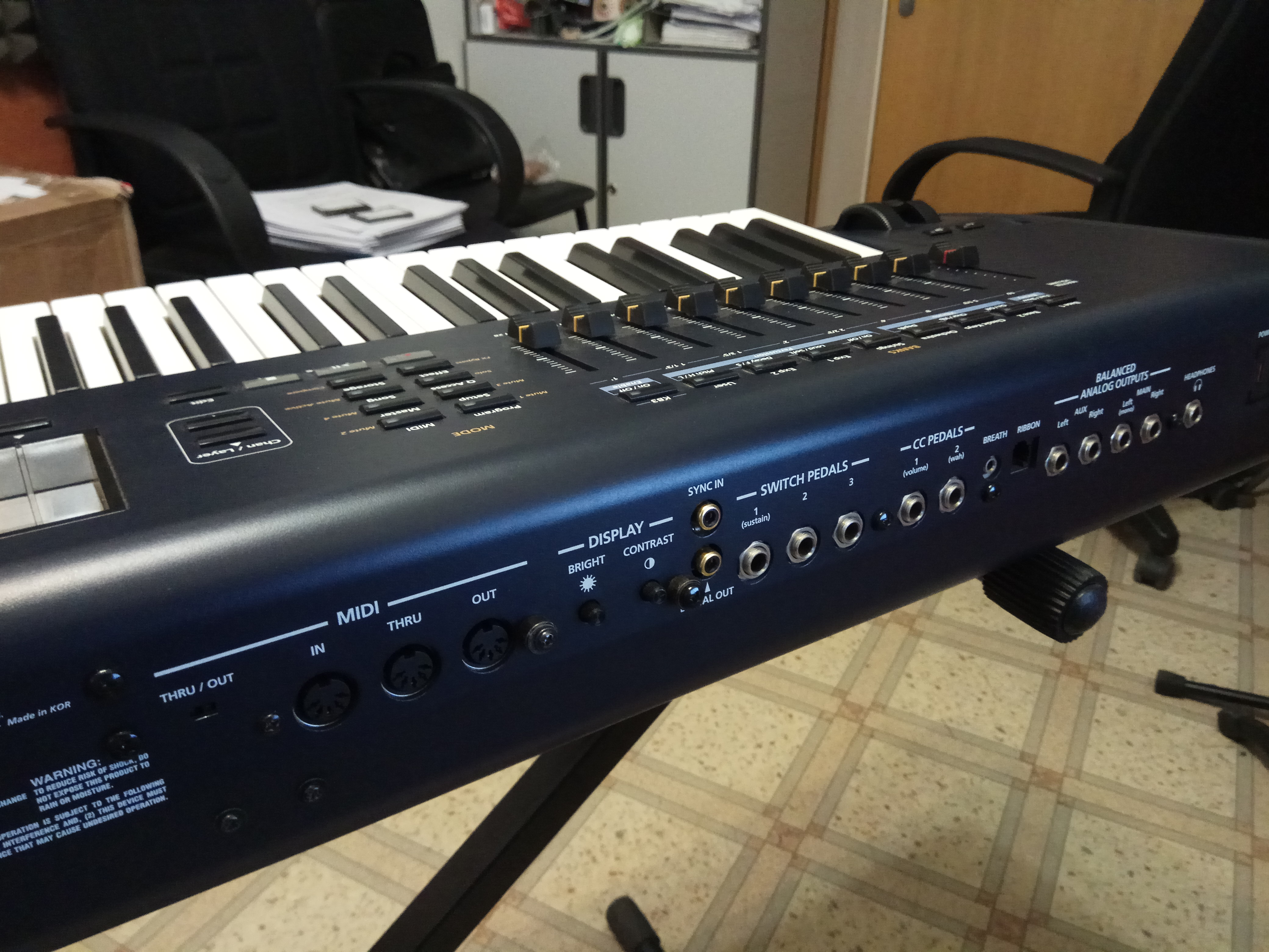 В хорошем состоянии. По гастролям не ездил, хотя мягкий кофр для транспортировки есть. Клавиатура 76-клавишная полувзвешенная с функцией послекасания. Клавиши полноразмерные.