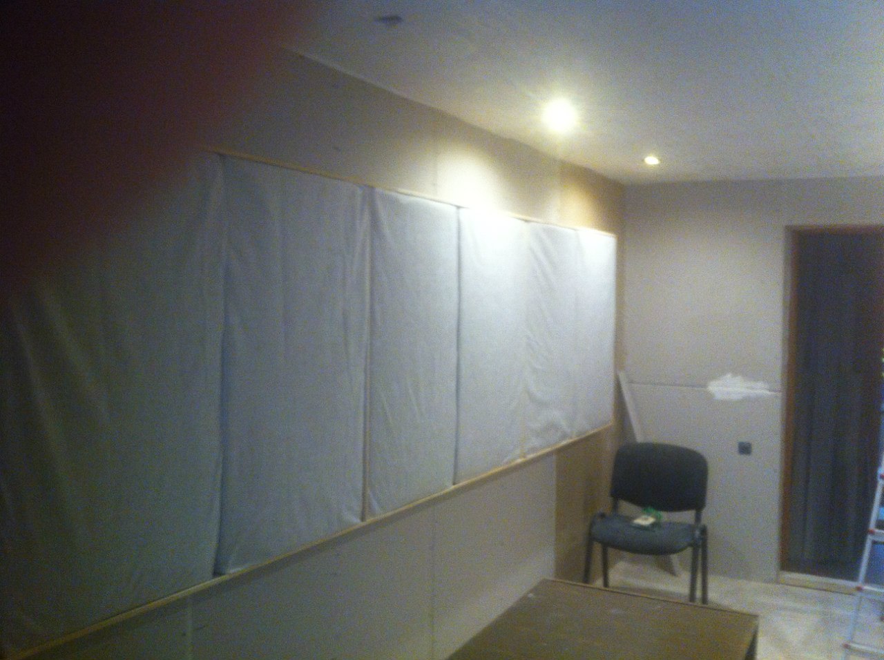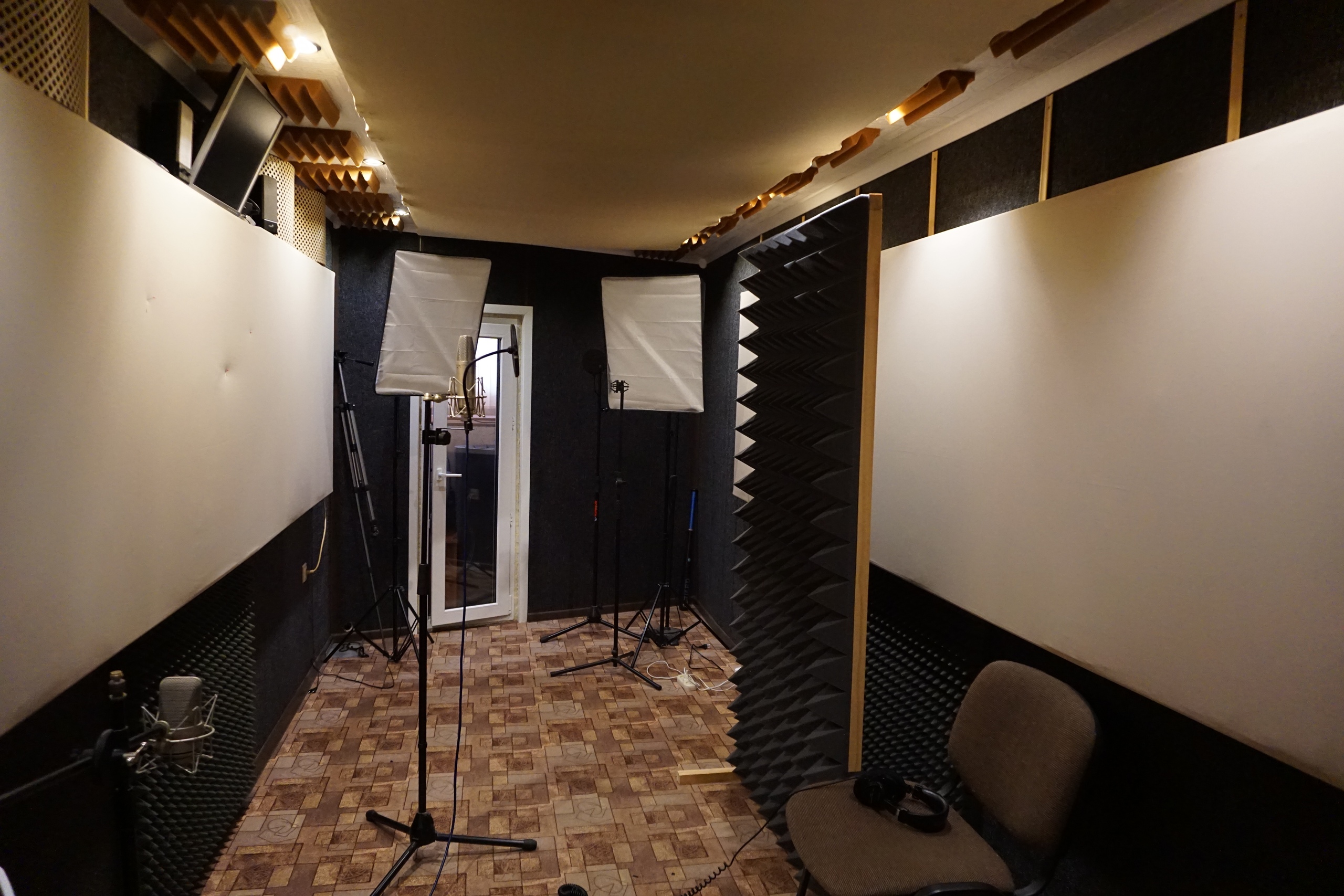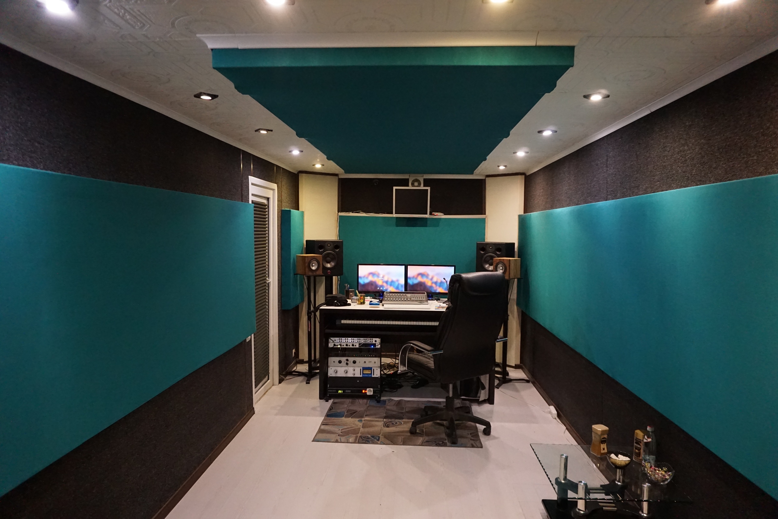 - акустический ремонт помещения, звукоизоляция "комната в комнате" (не контактирующая с бетонными перекрытиями) на "плавающем полу" (виброразвязка из 7 слоев пола и тд.) и акустическое оформление рабочих комнат по звукопоглощению. Звукоизоляция позволяет работать в студии в любое время, даже ночью при этом не мешая соседям... и конечно же они вам не помешают, абсолютная тишина, что является одним из главных факторов для работы со звуком!