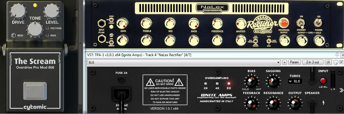 Осторожно, у лампового каскада высокий уровень выходного сигнала! Используйте большое деление на последнем каскаде. Впрочем, в плагине есть защитный клиппинг, который должен защитить от неосторожных действий.