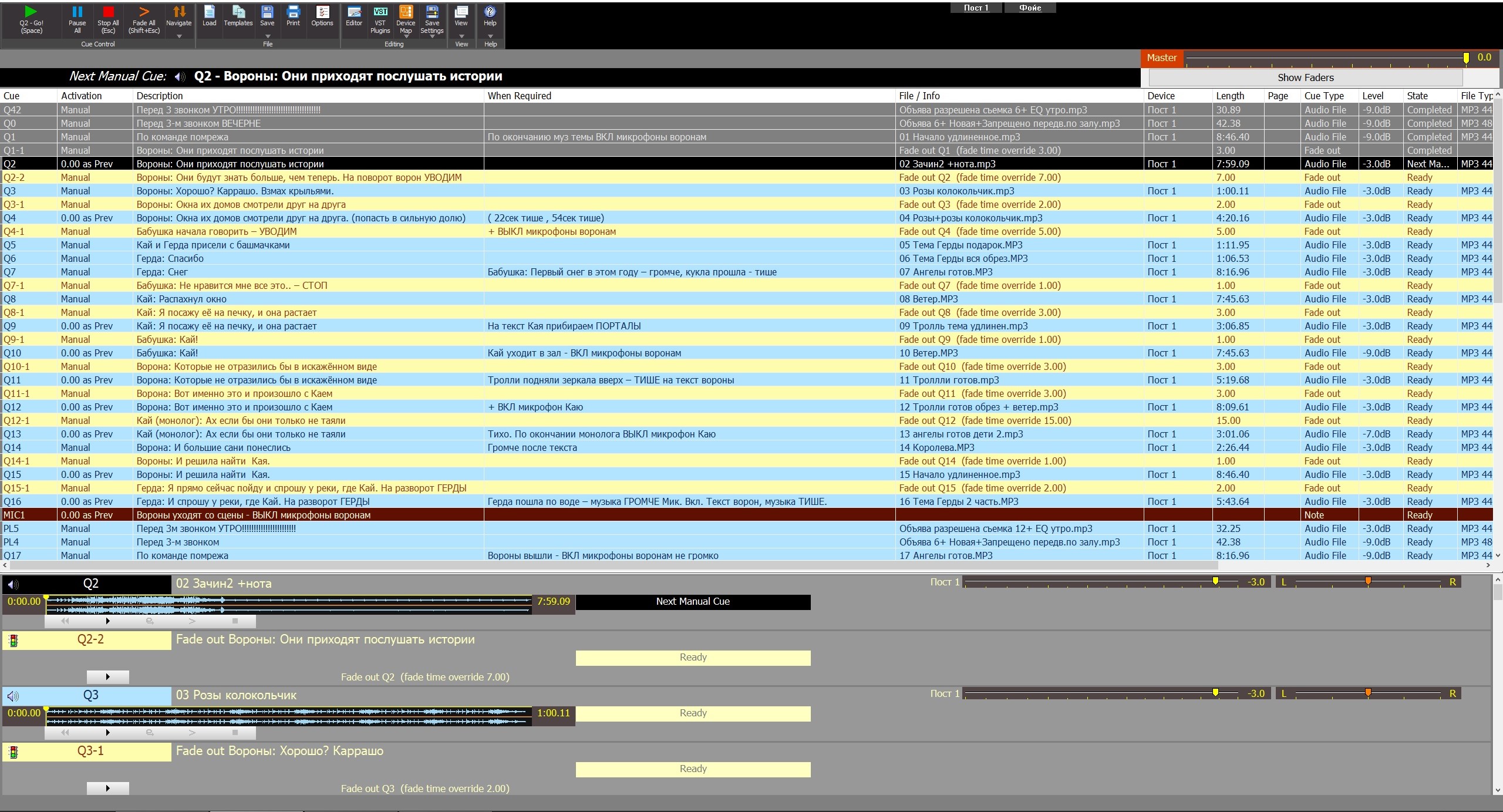 Так выглядит именно эта партитура (к этому спектаклю), другие иначе - например здесь я не выводил на монитор колонку "loop" потому, что в этом спектакле он не используется. Мы для каждого конкретного спектакля выводим на дисплей лишь необходимую информацию, а все детали остаются "за кадром". Это даёт возможность концентрироваться на именно спектакле. Практически, смотрим правую часть окна и жмём пробел)) Ну и ещё: с балансами, частоткой, реверберацией и т.п. мы работаем с микшера вживую.