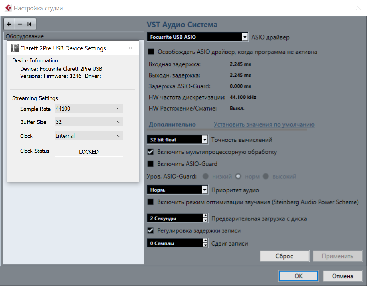 С последней версией драйверов 3.2.1 все косяки своими они исправили (единственное что микшер панель стала долго открываться и закрываться). Карта стала работать стабильно. Касаемо задержек, то вот данные из Cubase Pro 10 для частот 44100 и 96000.
