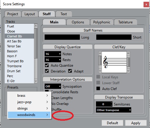 (сделать партию инструмента с ключем и соответствующим транспортом- альт, кларнет В и т.д.)