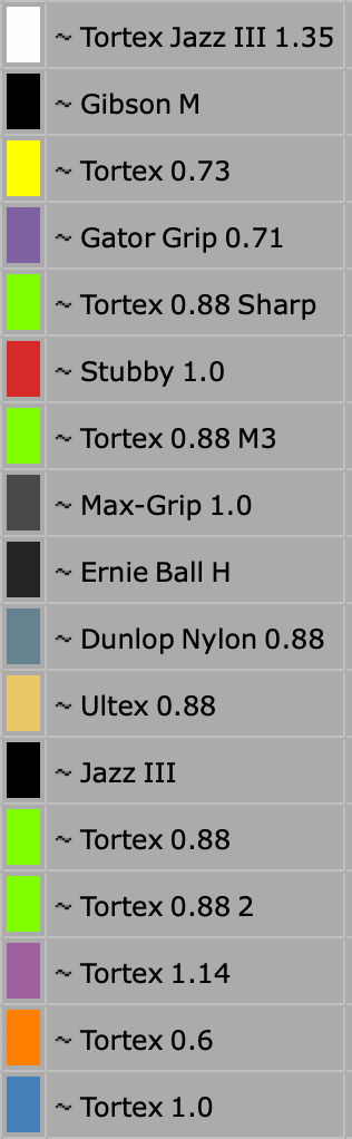 Пользуюсь тортех 1мм самый огонь, пробовал данлоп гатор, так себе убиваются очень быстро, тортекс III очень не удобные скользят в пальцах сильнее и кончик более острый.
