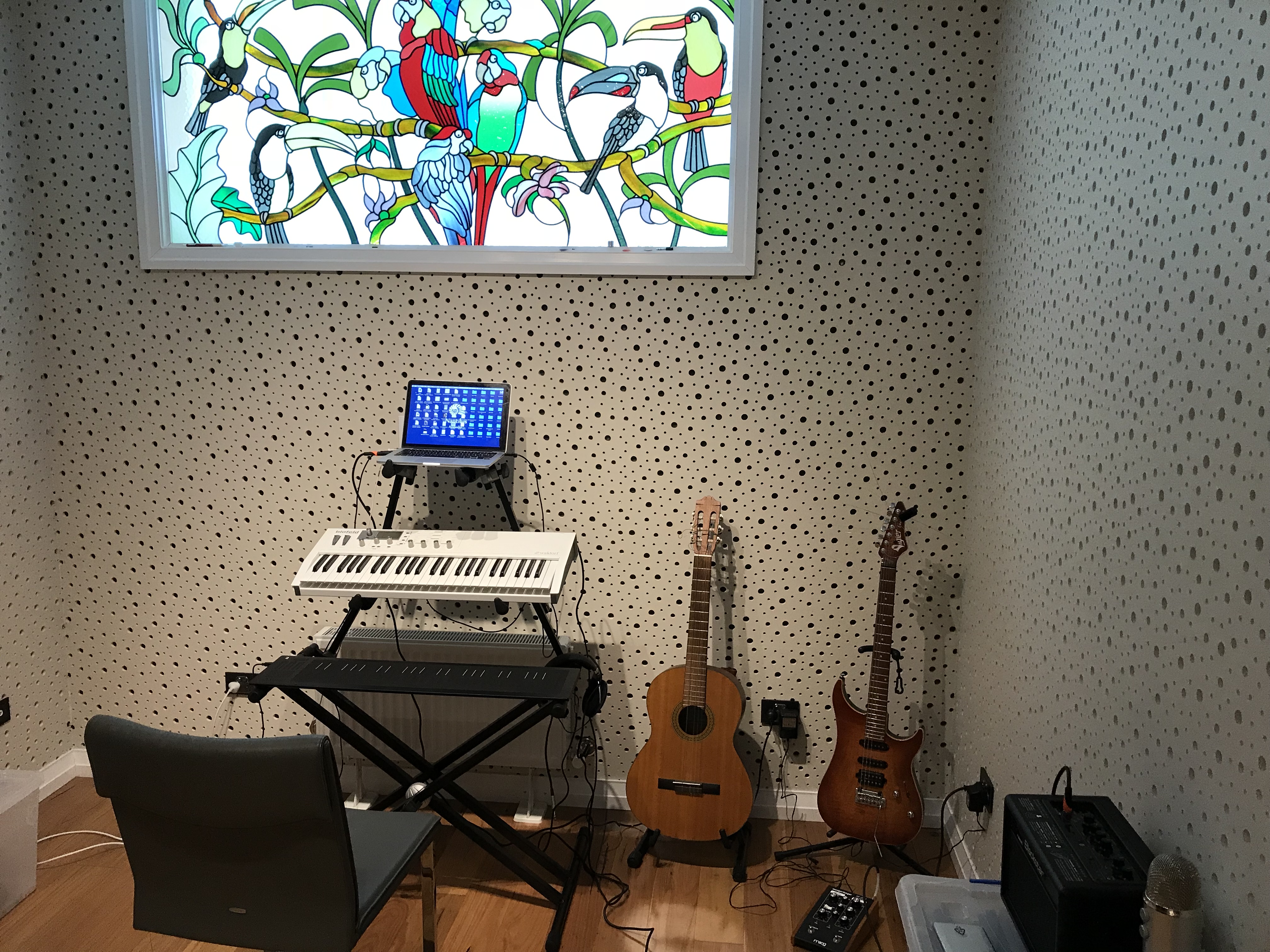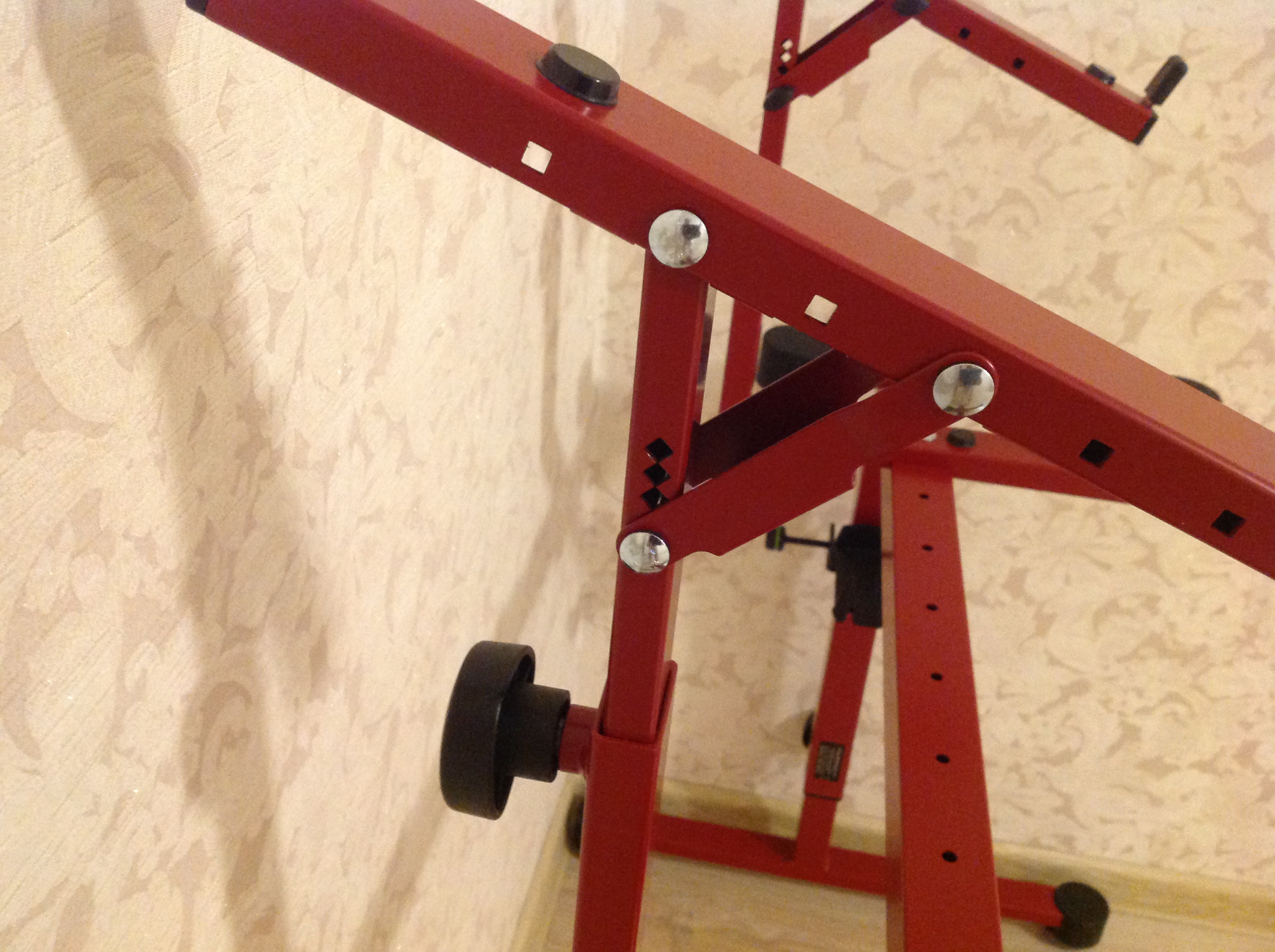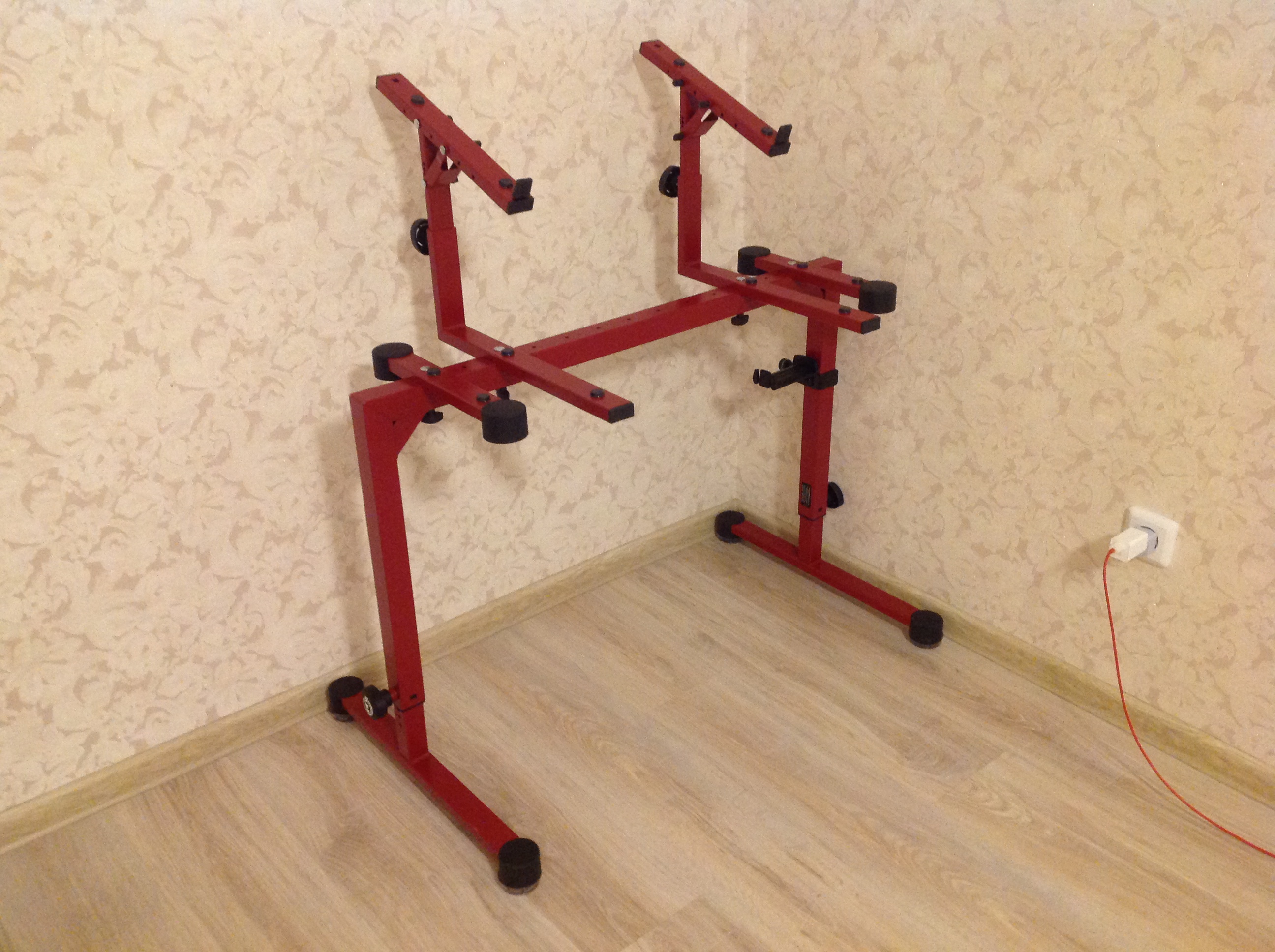 Рэк на первой фотке - там верхняя часть с меняющимся углом, по идее под рэковые приборы, но я сделал упор из уголка, что бы миди-клава не сползала и получилось вполне удобно - можно играть на ней правой рукой, а левой на двух других синтах на двухярусной стойке.
