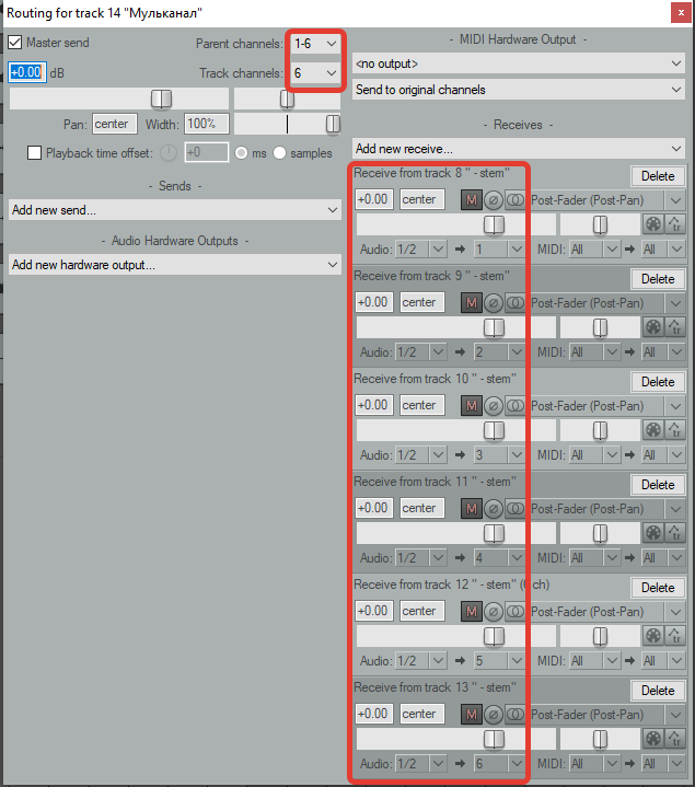Вот есть 6 каналов. Если в роуте каждого из них сделать 1-1, 2-2... 4-4....6-6, то я смогу сделать экспорт нормально поканально, да и другие дорожки любые к этим каналам примешать без проблем.