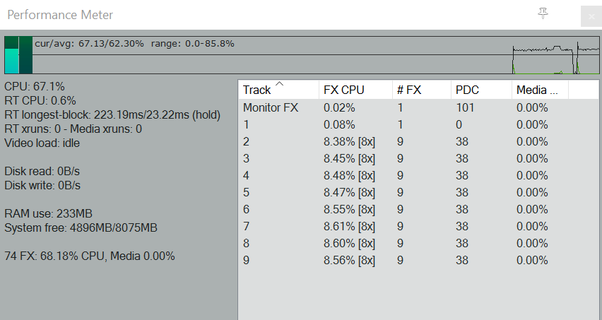 Если дальше грузить плагинами папку трек, то вместе с повышение CPU, начинает расти и RT, а вместе с ним и появляются выпадания. В принципе - это логично. Наступает предел CPU и для выполнения RT задач не хватает времени.