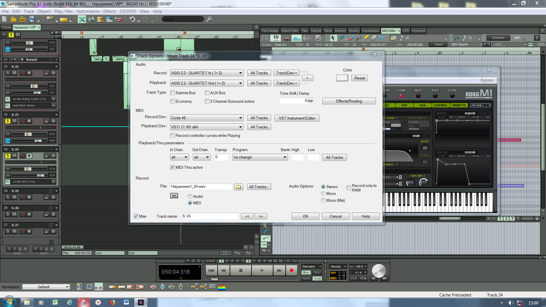 Продал, купил миди-клавиатуру M-audio 49. В основном все VSti управляются, а Korg нет. Настройки одинаковые для всех инструментов.