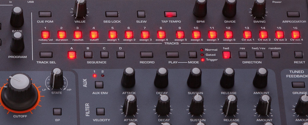 Четыре первые дорожки распределены на ноты, duration, ratchet, cutoff + 8 свободно присваемые любому параметру.
