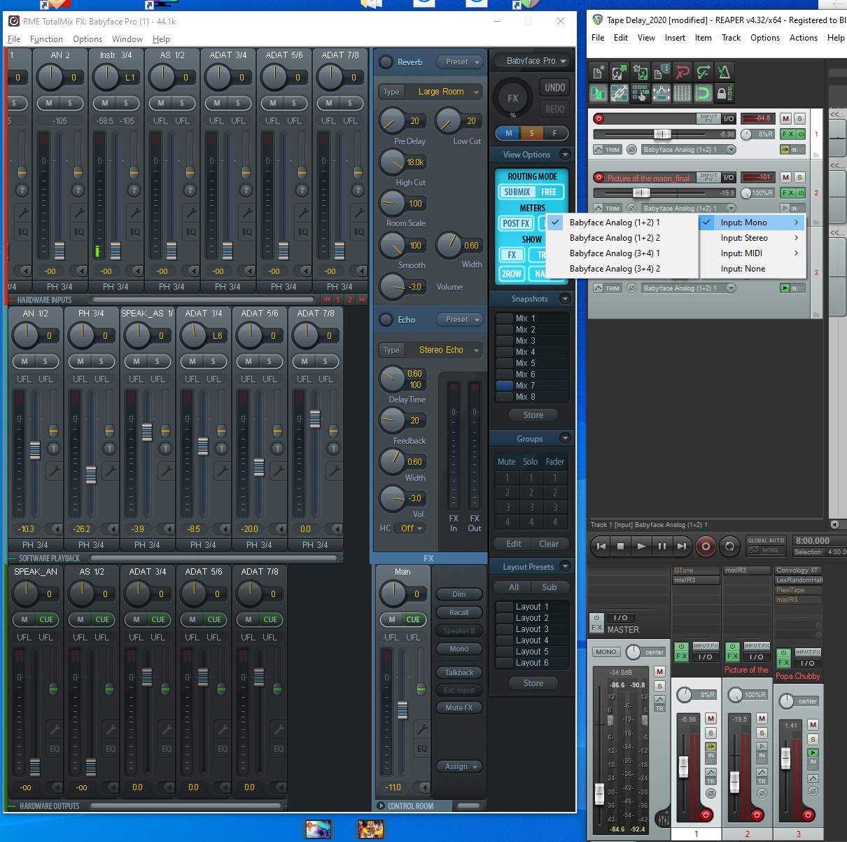 Прошу помощи у профи. После попытки установки плагина в Рипере слетели настройки входов/выходов в RME babyface pro. Я в этом плохо разбираюсь на раньше были задействованы входы 3 и 4 и в Рипере я их мог спокойно включать. Теперь на дорожках появляются не отдельные выходы 3 и 4 , а как на фото (3+4) 1 или (3+4) 2. В другом Standalone плагине в настройках входов вообще нет входов 3 и 4, а есть только (1+2) 1 и (1 + 2) 2. Что это может быть? Заранее спасибо за помощь!