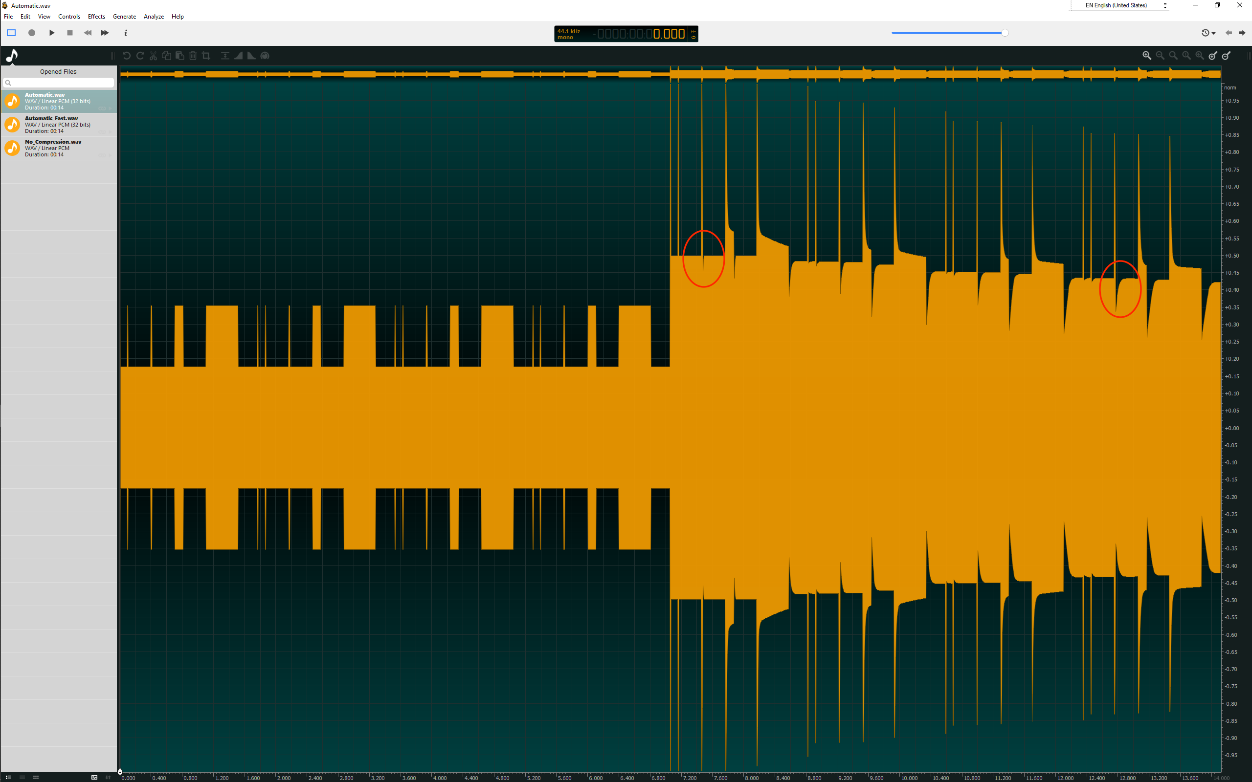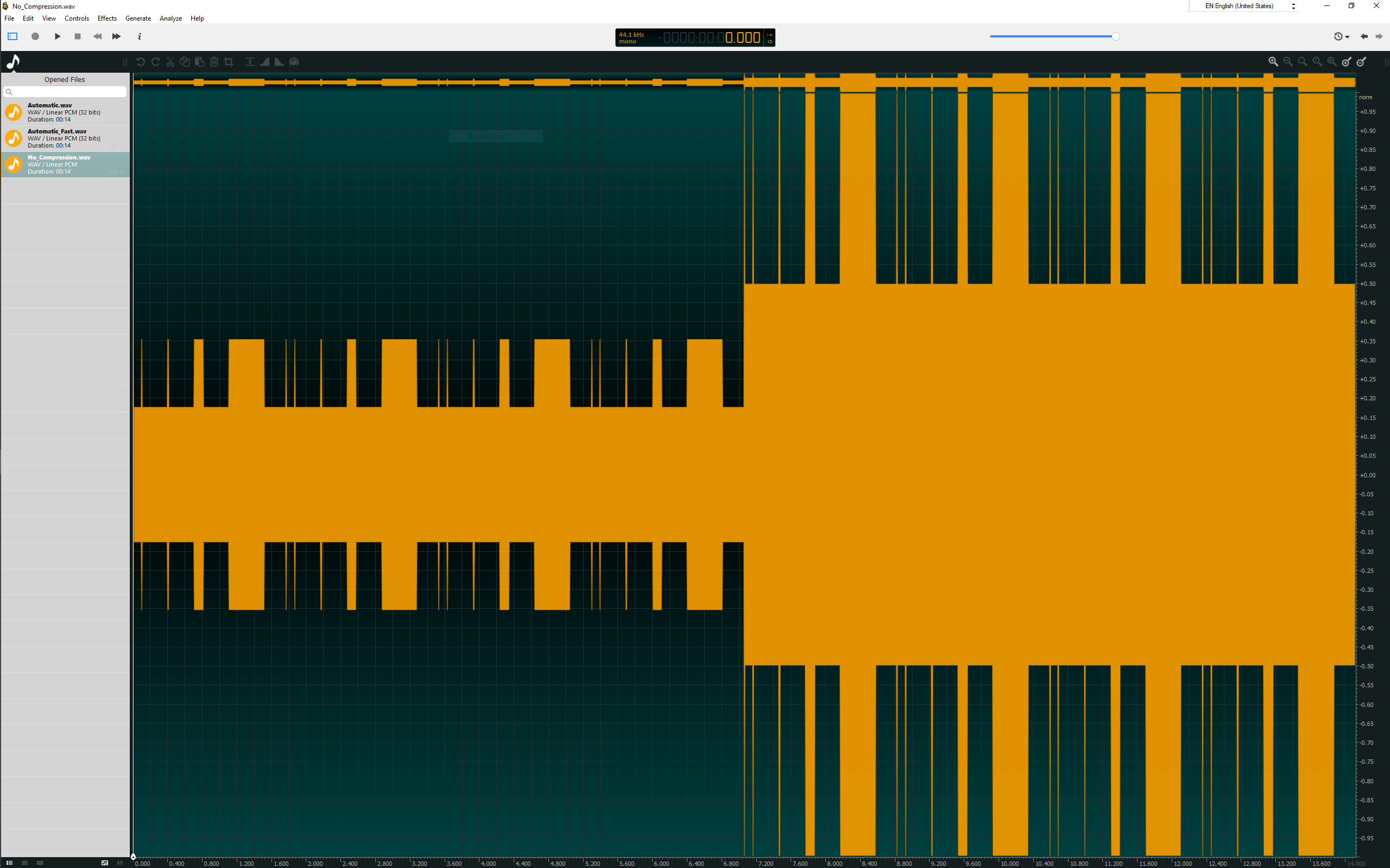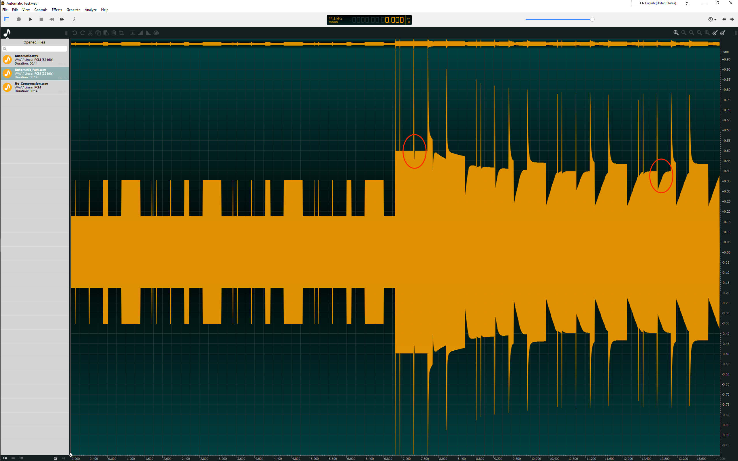 Вот что происжодит при запуске тестового файла с пиками -9/-15Дб в первой части и -0/-6Дб во второй, релиз 200мс, Auto speed 60мс, порог -9Дб, Ratio 8:1.