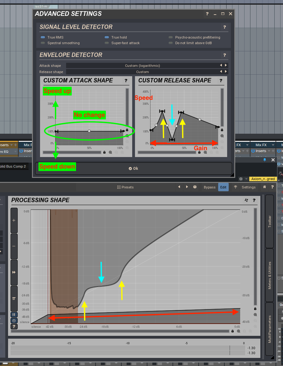 И ещё посмотрел Custom attack/release shape. Оказалось - по горизонтали уровень превышения порога в процентах, по вертикали - скорость реакции, т.е. горизонтальная линия на уровне 100% ничего не меняет, если её поднять до 400% - получится максимальная скорость. Можно подтюнивать атаку/релиз прямо в этих окнах.