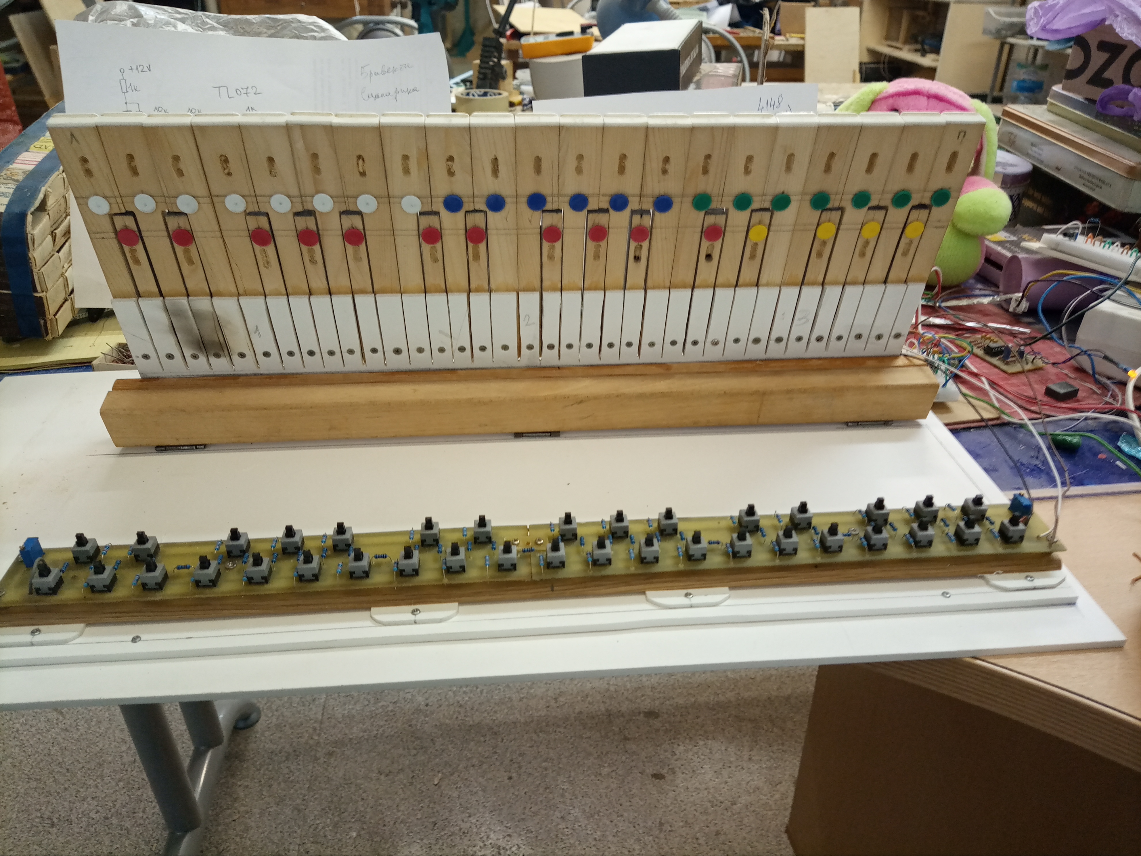 Здравствуйте .Всем всех благ! Уважаемый Коб, еще маленькое уточнение: регуляторы "глиссандо " и " модуляции " - какого номинала переменники будут, и какого типа лучше - движковые, или обычные? Или тут по желанию и наличию? Что б примерно место под них прикинуть слева от клавиатуры.