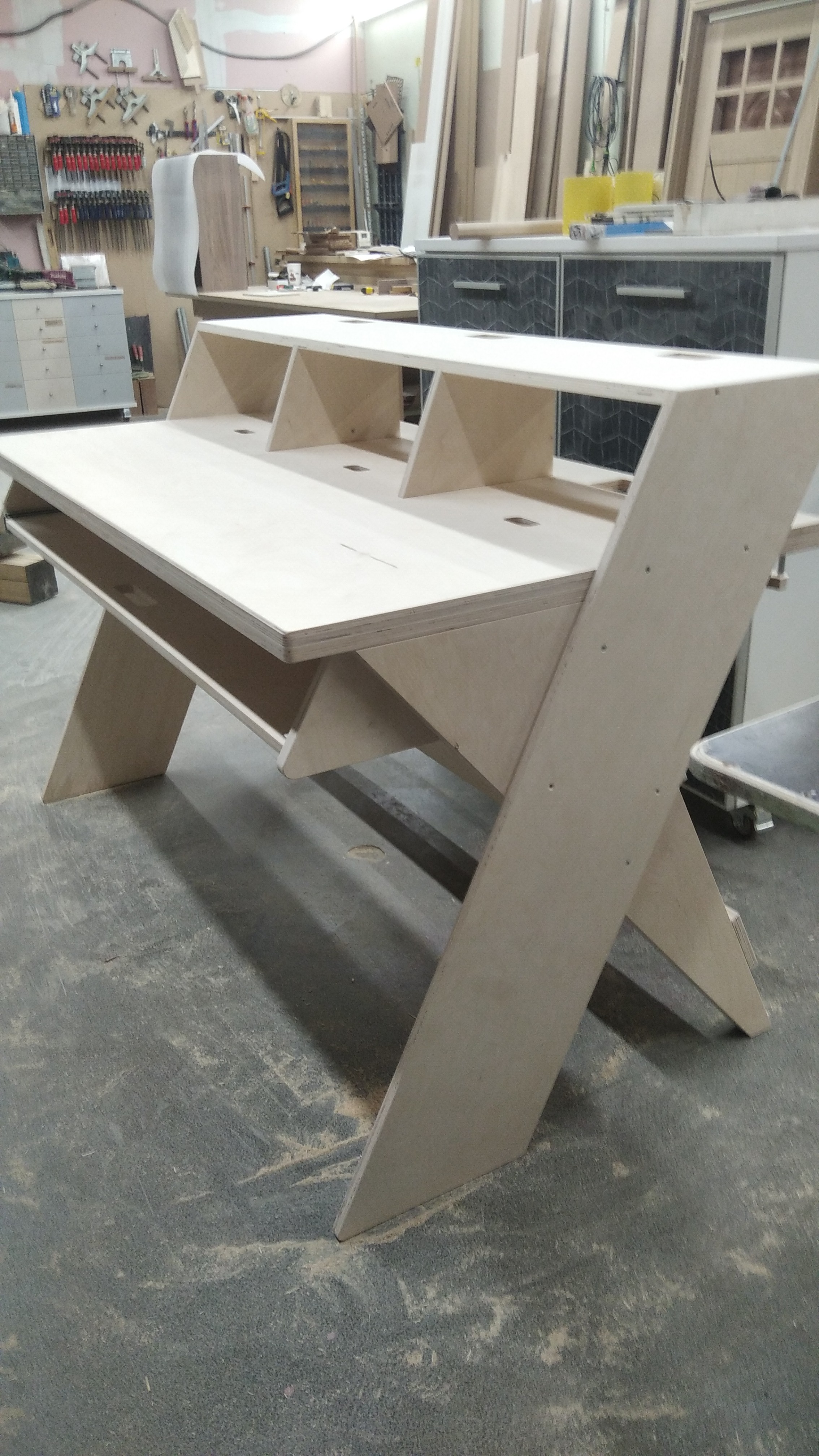 ). Стол авторской конструкции на основании "проб и ошибок", не копия чего-либо. Тумбу брал отдельно у AKM Mebel, с ней был нюанс, т.к. продавец стола мне назвал высоту до столешницы клавишной выезжающей полки, а за ней оказалось ещё и вертикальное ребро жесткости, в котором пришлось выпилить 5-см паз на ширину тумбы, чтобы "клавишная" часть могда выезжать вперёд, не цепляясь за заднюю стенку тумбы.