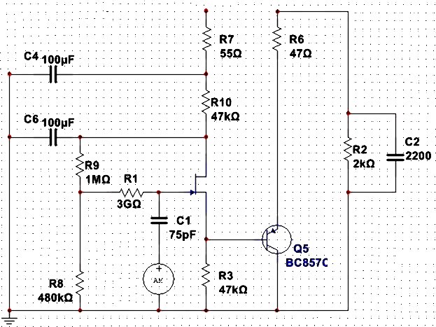 Если станете "вбивать" схему в мультисим - учтите, что модель 2SK30ATM там имеет иные ТХ.